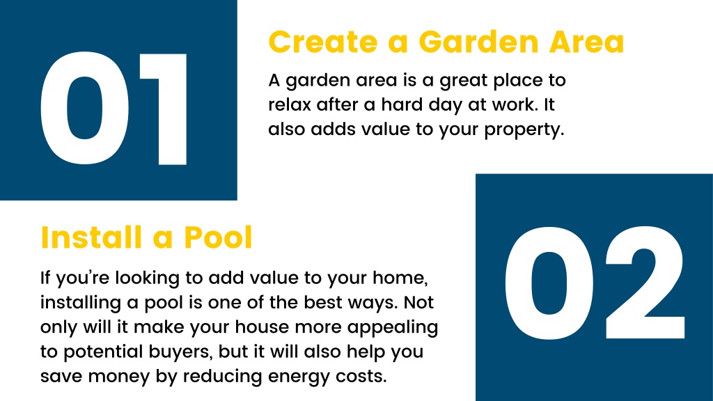 01 Install a Pool If you’re looking to add value to your home, installing a pool is one of the best ways. Not only will it make your house more appealing to potential buyers, but it will also help you save money by reducing energy costs. Create a Garden Area A garden area is a great place to relax after a hard day at work. It also adds value to your property. 02