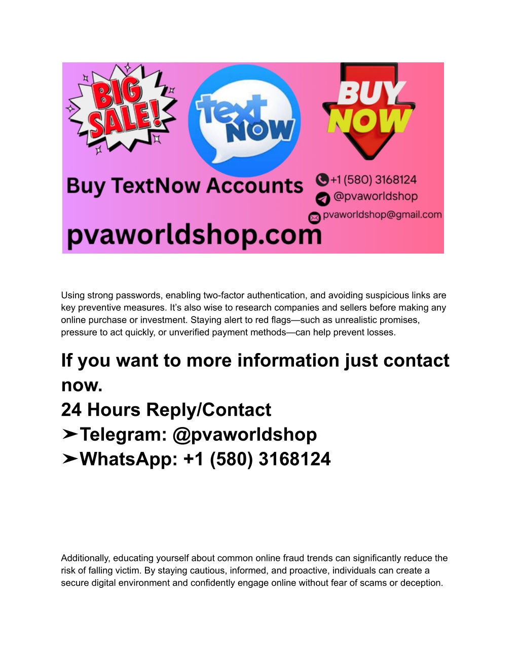 4. Using strong passwords, enabling two-factor authentication, and avoiding suspicious links are key preventive measures. It’s also wise to research companies and sellers before making any online purchase or investment. Staying alert to red flags—such as unrealistic promises, pressure to act quickly, or unverified payment methods—can help prevent losses. If you want to more information just contact now. 24 Hours Reply/Contact ➤Telegram: @pvaworldshop ➤WhatsApp: +1 (580) 3168124 Additionally, educating yourself about common online fraud trends can significantly reduce the risk of falling victim. By staying cautious, informed, and proactive, individuals can create a secure digital environment and confidently engage online without fear of scams or deception.