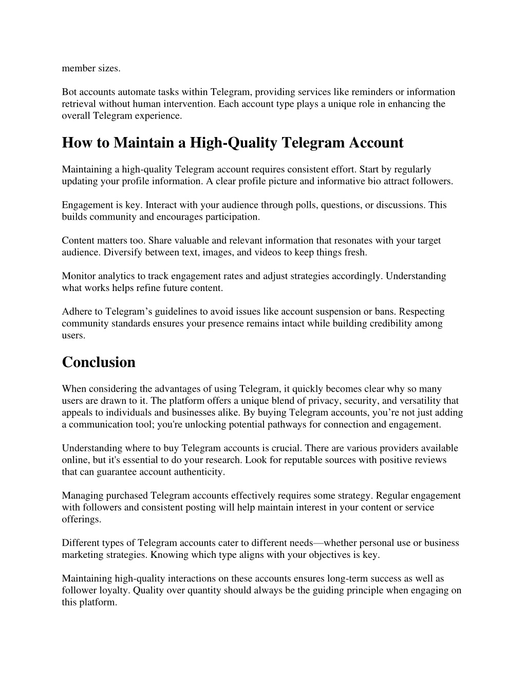 member sizes. Bot accounts automate tasks within Telegram, providing services like reminders or information retrieval without human intervention. Each account type plays a unique role in enhancing the overall Telegram experience. How to Maintain a High-Quality Telegram Account Maintaining a high-quality Telegram account requires consistent effort. Start by regularly updating your profile information. A clear profile picture and informative bio attract followers. Engagement is key. Interact with your audience through polls, questions, or discussions. This builds community and encourages participation. Content matters too. Share valuable and relevant information that resonates with your target audience. Diversify between text, images, and videos to keep things fresh. Monitor analytics to track engagement rates and adjust strategies accordingly. Understanding what works helps refine future content. Adhere to Telegram’s guidelines to avoid issues like account suspension or bans. Respecting community standards ensures your presence remains intact while building credibility among users. Conclusion When considering the advantages of using Telegram, it quickly becomes clear why so many users are drawn to it. The platform offers a unique blend of privacy, security, and versatility that appeals to individuals and businesses alike. By buying Telegram accounts, you’re not just adding a communication tool; you're unlocking potential pathways for connection and engagement. Understanding where to buy Telegram accounts is crucial. There are various providers available online, but it's essential to do your research. Look for reputable sources with positive reviews that can guarantee account authenticity. Managing purchased Telegram accounts effectively requires some strategy. Regular engagement with followers and consistent posting will help maintain interest in your content or service offerings. Different types of Telegram accounts cater to different needs—whether personal use or business marketing strategies. Knowing which type aligns with your objectives is key. Maintaining high-quality interactions on these accounts ensures long-term success as well as follower loyalty. Quality over quantity should always be the guiding principle when engaging on this platform.
