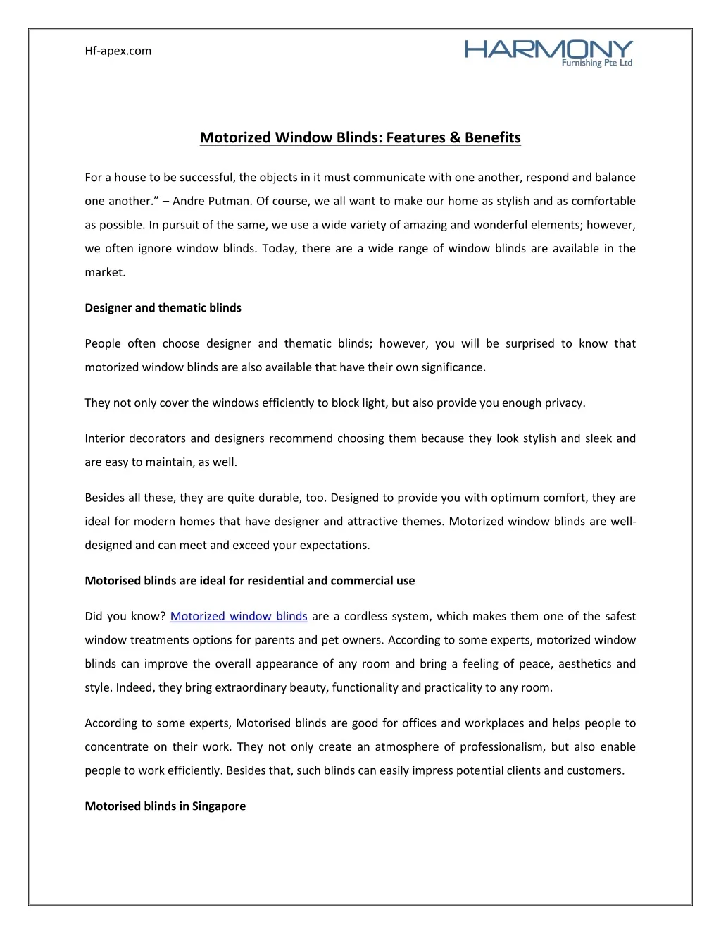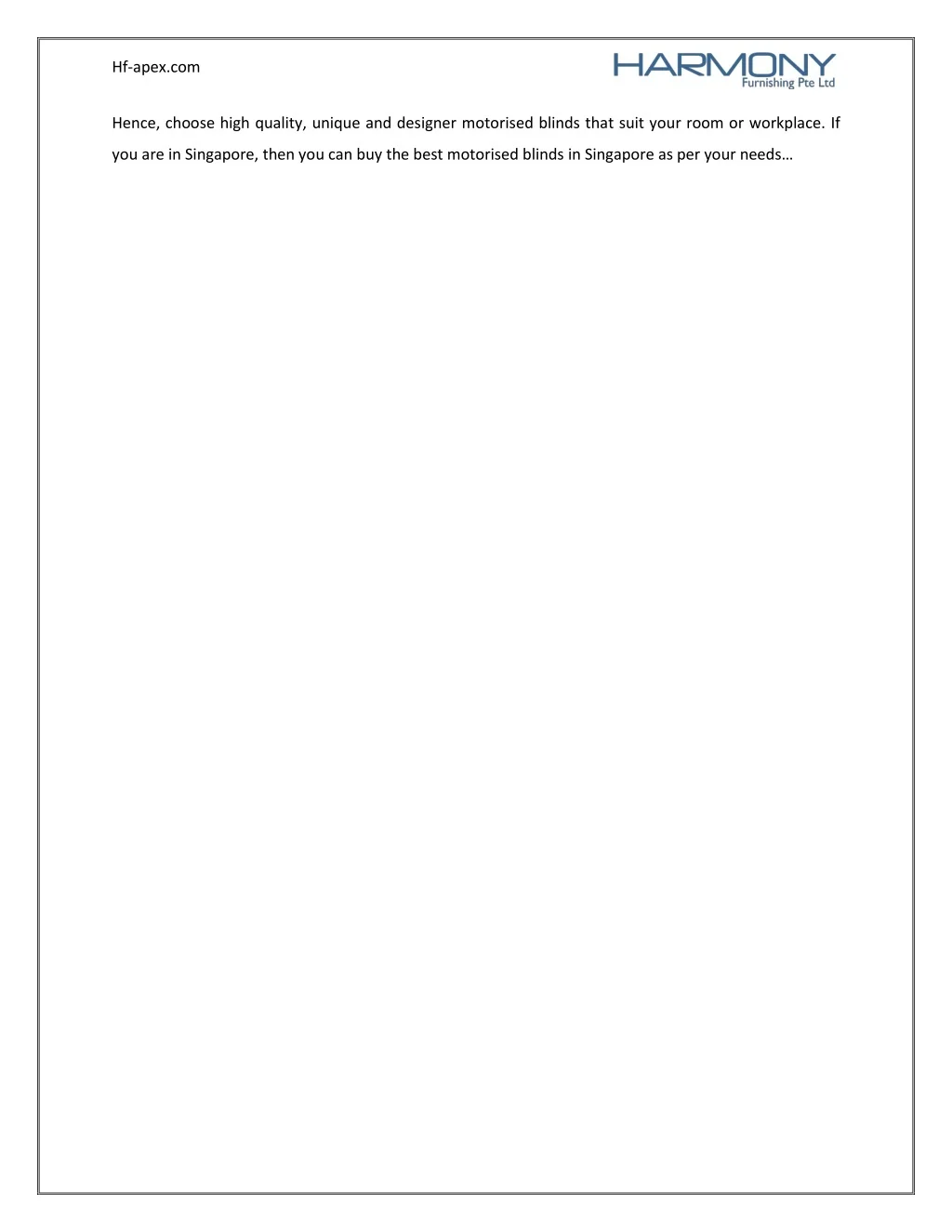 Hf-apex.com Hence, choose high quality, unique and designer motorised blinds that suit your room or workplace. If you are in Singapore, then you can buy the best motorised blinds in Singapore as per your needs…