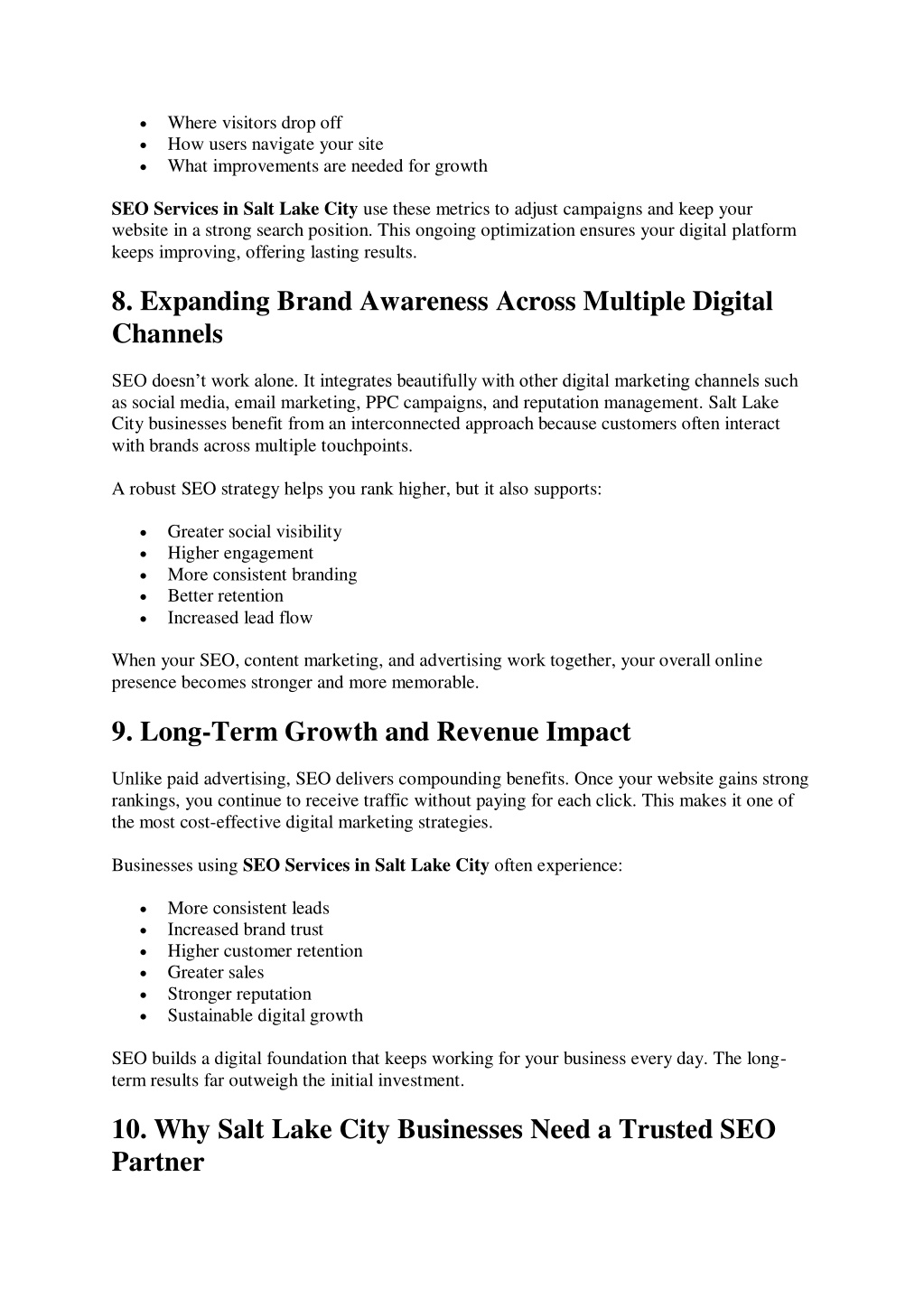 Where visitors drop off How users navigate your site What improvements are needed for growth SEO Services in Salt Lake City use these metrics to adjust campaigns and keep your website in a strong search position. This ongoing optimization ensures your digital platform keeps improving, offering lasting results. 8. Expanding Brand Awareness Across Multiple Digital Channels SEO doesn’t work alone. It integrates beautifully with other digital marketing channels such as social media, email marketing, PPC campaigns, and reputation management. Salt Lake City businesses benefit from an interconnected approach because customers often interact with brands across multiple touchpoints. A robust SEO strategy helps you rank higher, but it also supports: Greater social visibility Higher engagement More consistent branding Better retention Increased lead flow When your SEO, content marketing, and advertising work together, your overall online presence becomes stronger and more memorable. 9. Long-Term Growth and Revenue Impact Unlike paid advertising, SEO delivers compounding benefits. Once your website gains strong rankings, you continue to receive traffic without paying for each click. This makes it one of the most cost-effective digital marketing strategies. Businesses using SEO Services in Salt Lake City often experience: More consistent leads Increased brand trust Higher customer retention Greater sales Stronger reputation Sustainable digital growth SEO builds a digital foundation that keeps working for your business every day. The long- term results far outweigh the initial investment. 10. Why Salt Lake City Businesses Need a Trusted SEO Partner