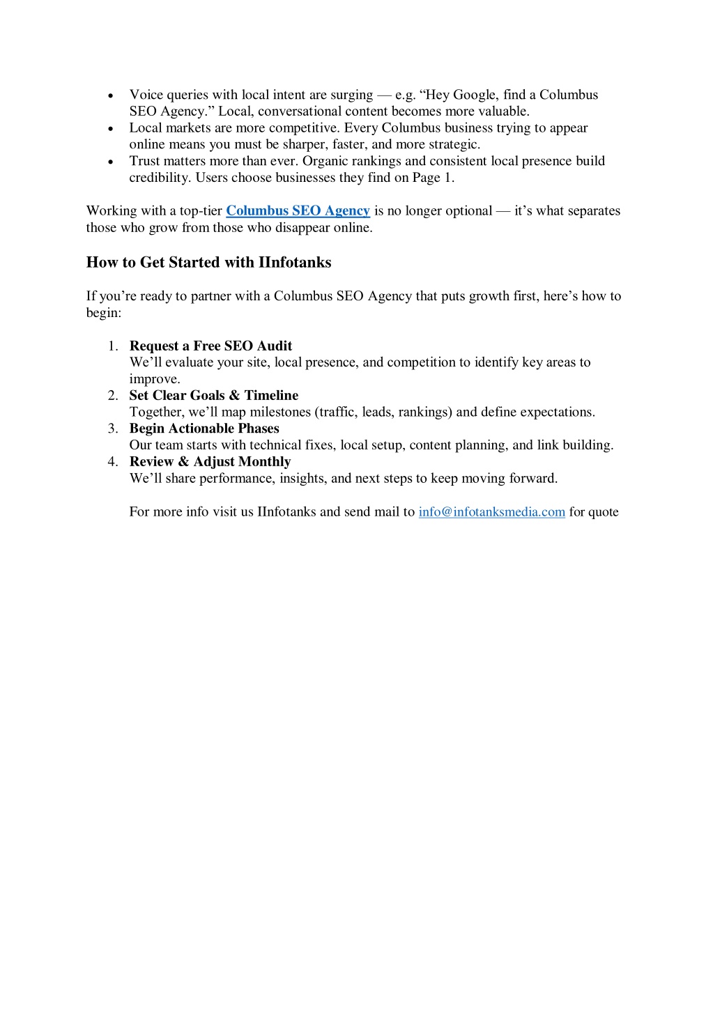 Voice queries with local intent are surging —e.g. “Hey Google, find a Columbus SEO Agency.” Local, conversational content becomes more valuable. Local markets are more competitive. Every Columbus business trying to appear online means you must be sharper, faster, and more strategic. Trust matters more than ever. Organic rankings and consistent local presence build credibility. Users choose businesses they find on Page 1. Working with a top-tier Columbus SEO Agency is no longer optional —it’s what separates those who grow from those who disappear online. How to Get Started with IInfotanks If you’re ready to partner with a Columbus SEO Agency that puts growth first, here’s how to begin: 1.Request a Free SEO Audit We’ll evaluate your site, local presence, and competition to identify key areas to improve. 2.Set Clear Goals & Timeline Together, we’ll map milestones (traffic, leads, rankings) and define expectations. 3.Begin Actionable Phases Our team starts with technical fixes, local setup, content planning, and link building. 4.Review & Adjust Monthly We’ll share performance, insights, and next steps to keep moving forward. For more info visit us IInfotanks and send mail to info@infotanksmedia.com for quote