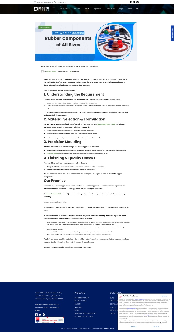 contact@harkeshrubber.com +91-22-40060400 Our Products Industries About Engineering Know How Blogs Contact RUBBER INDUSTRY Quick Enquiry How We Manufacture Rubber Components of All Sizes BY HARKESH-RUBBER ON AUGUST 21, 2025 0 COMMENTS When you think of rubber components, the first thing that might come to mind is a small O-ring or gasket. But at Harkesh Rubber LLP, from micro-precision parts to large-diameter seals, our manufacturing capabilities are designed to deliver reliability, performance, and consistency. Here’s a peek into how we make it happen. 1. Understanding the Requirement Every project starts with understanding the application, environment, and performance expectations. Small parts often require high precision for sealing, insulation, or vibration damping. Large parts may need strength, flexibility, and resistance to extreme conditions such as high pressure, temperature variations, or chemical exposure. Our engineering team works closely with clients to select the right material and design, ensuring every dimension and property is fit for purpose. 2. Material Selection & Formulation We work with a wide range of polymers, from Nitrile (NBR) and EPDM to Fluoroelastomers (FKM) and Silicone, customizing compounds to meet specific industry standards. For sub-zero applications, we develop low-temperature resistant compounds. For high-performance environments, we use heat- and chemical-resistant blends. Our in-house compounding ensures consistent quality from batch to batch. 3. Precision Moulding Whether the component is small or large, the moulding process is critical: Micro & small components: Manufactured using compression, transfer, or injection moulding, with tight tolerances and minimal flash. Large components: Produced with careful temperature and pressure control to ensure uniform curing. 4. Finishing & Quality Checks Post-moulding, each part undergoes specialized finishing: Cryogenic deflashing for small components to remove micro burrs without affecting dimensions. Manual trimming & inspection for large components to maintain edge integrity. We use automatic visual inspection machines for precision parts and rigorous manual checks for bigger components. Our Promise No matter the size, our approach remains constant i.e engineering precision, uncompromising quality, and customer-focused solutions. Our every product carries our signature of trust. At Harkesh Rubber LLP, we don’t just make rubber parts, we create components that keep industries running smoothly. Our Batch Weighing Machine In the world of high-performance rubber components, accuracy starts at the very first step, preparing the perfect batch. At Harkesh Rubber LLP, our batch weighing machine plays a crucial role in ensuring that every ingredient in our rubber compounds is measured with uncompromising precision. Exact Ingredient Measurement – Every compound formulation demands specific proportions to achieve the desired mechanical, chemical, and thermal properties. Topson’s automated weighing system ensures these are achieved consistently, every time. Automation for Reliability – The machine minimizes human intervention, reducing the possibility of manual errors and maintaining uniformity across batches. Improved Efficiency – Faster, more accurate batching means smoother production flow and reduced downtime. Data & Traceability – We can log and review every batch detail for quality audits and process optimization. This isn’t just about weighing materials — it’s about laying the foundation for components that meet the toughest industry standards in valves, flow control, automotive, and beyond. Because quality starts with precision, and precision starts here. PRODUCTS QUICK LINKS Mumbai Office: Harkesh Rubber LLP, 108, Adarsh Industrial Estate, Sahar Road, We Value Your Privacy SETTINGS RUBBER DIAPHRAGM BLOG Chakala, Andheri (East), Mumbai 400099 NextRoll, Inc. ("NextRoll") and our 20 advertising partners use cookies and similar technologies on this site and use BUTTERFLY SEALS CASE STUDIES personal data (e.g., your IP address). If you consent, the cookies, device identifiers, or other information can be stored or accessed on your device for the purposes described below. You can click "Allow All" or "Decline All" or GASKETS DOWNLOADS click Settings above to customise your consent regarding the purposes and features for which your personal data USA Office: Harkesh Rubber LLP, 415 will be processed and/or the partners with whom you will share personal data. WIRE SEALS CAREERS Boston Post Rd, Ste 3-116, Milford, CT NextRoll and our advertising partners process personal data to: ● Store and/or access information on a device; ● O RING DEALERSHIP ENQUIRIES Create a personalised content profile; ● Select personalised content; ● Personalised advertising, advertising 06460 measurement, audience research and services development; ● Services development. For some of the purposes SOLAR INDUSTRY COMPONENTS GALLERY above, our advertising partners: ● Use precise geolocation data. Some of our partners rely on their legitimate business interests to process personal data. View our advertising partners if you wish to provide or deny consent CUSTOMIZED COMPONENT for specific partners, review the purposes each partner believes they have a legitimate interest for, and object to such processing. If you select Decline All, you will still be able to view content on this site and you will still receive advertising, but the advertising will not be tailored for you. You may change your setting whenever you see the on this site. DECLINE ALL ALLOW ALL Copyright © 2025 Harkesh Rubber Industries. All Rights Reserved. Privacy Policy