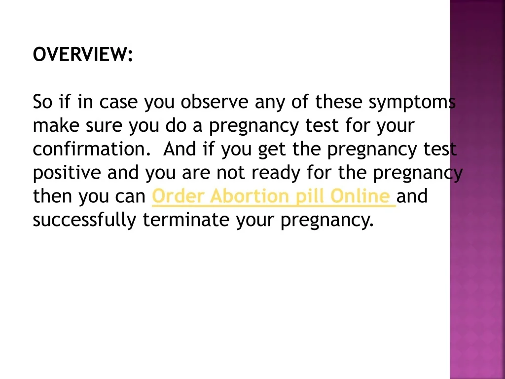 OVERVIEW: So if in case you observe any of these symptoms make sure you do a pregnancy test for your confirmation. And if you get the pregnancy test positive and you are not ready for the pregnancy then you can Order Abortion pill Online and successfully terminate your pregnancy.