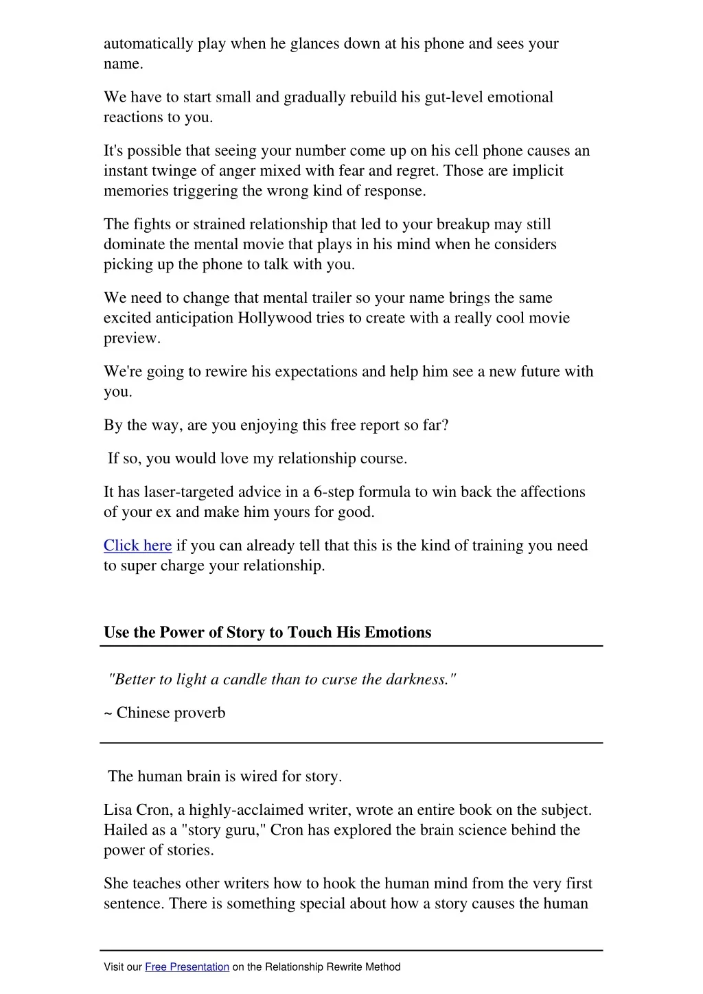 automatically play when he glances down at his phone and sees your name. We have to start small and gradually rebuild his gut-level emotional reactions to you. It's possible that seeing your number come up on his cell phone causes an instant twinge of anger mixed with fear and regret. Those are implicit memories triggering the wrong kind of response. The fights or strained relationship that led to your breakup may still dominate the mental movie that plays in his mind when he considers picking up the phone to talk with you. We need to change that mental trailer so your name brings the same excited anticipation Hollywood tries to create with a really cool movie preview. We're going to rewire his expectations and help him see a new future with you. By the way, are you enjoying this free report so far? If so, you would love my relationship course. It has laser-targeted advice in a 6-step formula to win back the affections of your ex and make him yours for good. Click here if you can already tell that this is the kind of training you need to super charge your relationship. Use the Power of Story to Touch His Emotions "Better to light a candle than to curse the darkness." ~ Chinese proverb The human brain is wired for story. Lisa Cron, a highly-acclaimed writer, wrote an entire book on the subject. Hailed as a "story guru," Cron has explored the brain science behind the power of stories. She teaches other writers how to hook the human mind from the very first sentence. There is something special about how a story causes the human Visit our Free Presentation on the Relationship Rewrite Method