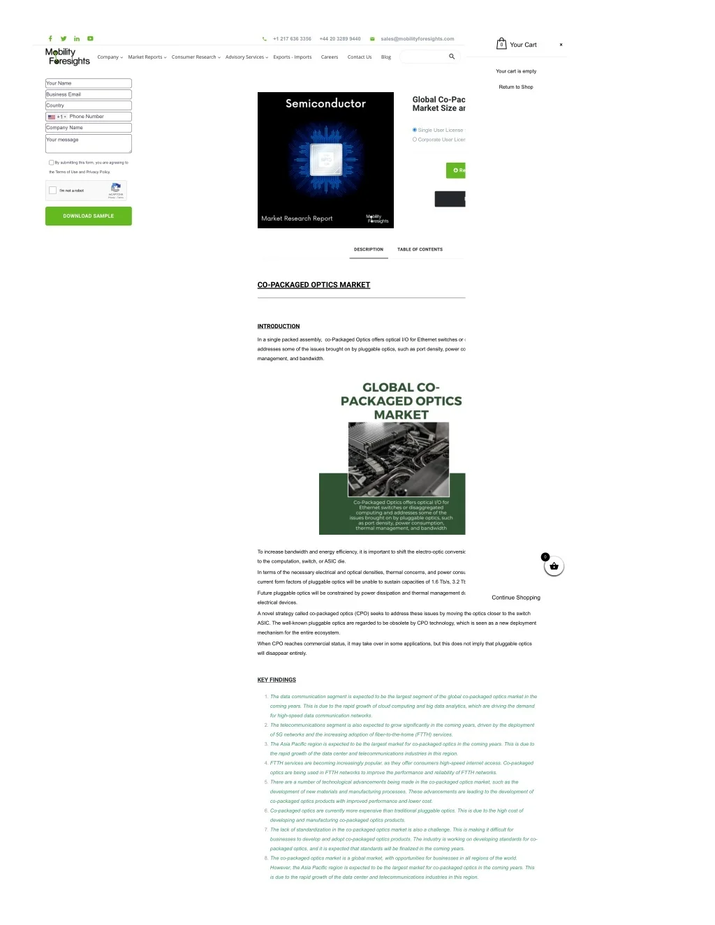 1.    +1 217 636 3356 +44 20 3289 9440 sales@mobilityforesights.com    Your Cart 0   Company  Market Reports  Consumer Research  Advisory Services  Exports - Imports Careers Contact Us Blog Your cart is empty Your Name Return to Shop Business Email Global Co-Packaged Optics Market Size and Forecasts 2030 Country Phone Number +1 Company Name Single User License : $ 4,000 Your message Corporate User License : $ 6,000 By submitting this form, you are agreeing to  Request Sample the Terms of Use and Privacy Policy. I'm not a robot reCAPTCHA Privacy - Terms BUY NOW DOWNLOAD SAMPLE DESCRIPTION TABLE OF CONTENTS CO-PACKAGED OPTICS MARKET INTRODUCTION In a single packed assembly, co-Packaged Optics offers optical I/O for Ethernet switches or disaggregated computing and addresses some of the issues brought on by pluggable optics, such as port density, power consumption, thermal management, and bandwidth. To increase bandwidth and energy efficiency, it is important to shift the electro-optic conversion process as close as feasible 0 to the computation, switch, or ASIC die.  In terms of the necessary electrical and optical densities, thermal concerns, and power consumption, it is anticipated that the current form factors of pluggable optics will be unable to sustain capacities of 1.6 Tb/s, 3.2 Tb/s, and higher. Future pluggable optics will be constrained by power dissipation and thermal management due to the deployment of discrete Continue Shopping electrical devices. A novel strategy called co-packaged optics (CPO) seeks to address these issues by moving the optics closer to the switch ASIC. The well-known pluggable optics are regarded to be obsolete by CPO technology, which is seen as a new deployment mechanism for the entire ecosystem. When CPO reaches commercial status, it may take over in some applications, but this does not imply that pluggable optics will disappear entirely. KEY FINDINGS 1. The data communication segment is expected to be the largest segment of the global co-packaged optics market in the coming years. This is due to the rapid growth of cloud computing and big data analytics, which are driving the demand for high-speed data communication networks. 2. The telecommunications segment is also expected to grow significantly in the coming years, driven by the deployment of 5G networks and the increasing adoption of fiber-to-the-home (FTTH) services. 3. The Asia Pacific region is expected to be the largest market for co-packaged optics in the coming years. This is due to the rapid growth of the data center and telecommunications industries in this region. 4. FTTH services are becoming increasingly popular, as they offer consumers high-speed internet access. Co-packaged optics are being used in FTTH networks to improve the performance and reliability of FTTH networks. 5. There are a number of technological advancements being made in the co-packaged optics market, such as the development of new materials and manufacturing processes. These advancements are leading to the development of co-packaged optics products with improved performance and lower cost. 6. Co-packaged optics are currently more expensive than traditional pluggable optics. This is due to the high cost of developing and manufacturing co-packaged optics products. 7. The lack of standardization in the co-packaged optics market is also a challenge. This is making it difficult for businesses to develop and adopt co-packaged optics products. The industry is working on developing standards for co- packaged optics, and it is expected that standards will be finalized in the coming years. 8. The co-packaged optics market is a global market, with opportunities for businesses in all regions of the world. However, the Asia Pacific region is expected to be the largest market for co-packaged optics in the coming years. This is due to the rapid growth of the data center and telecommunications industries in this region.