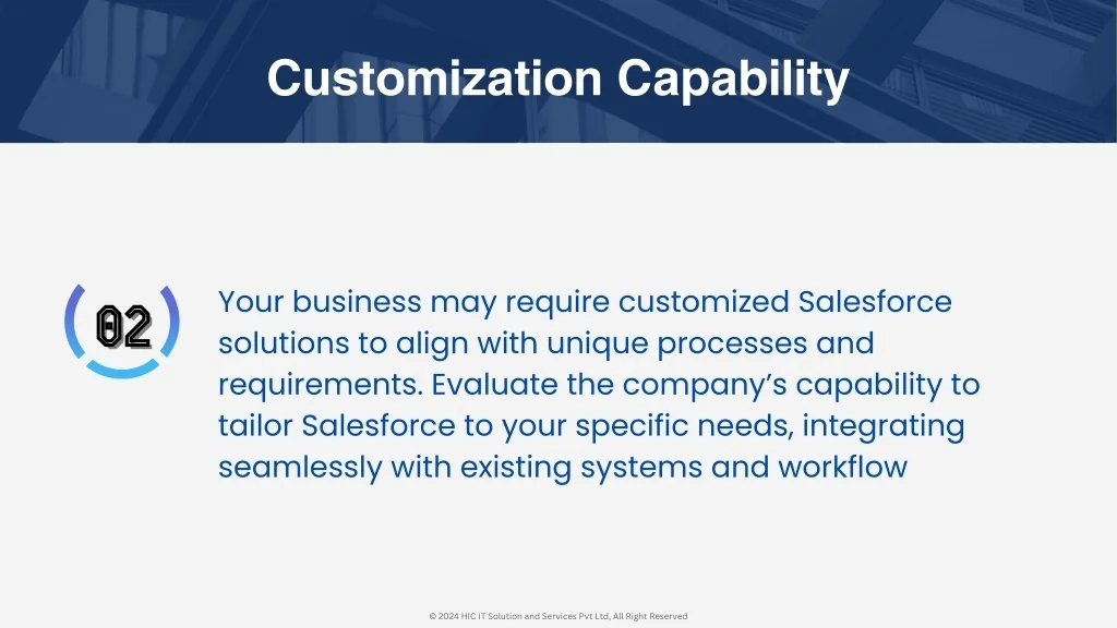 Customization Capability Your business may require customized Salesforce solutions to align with unique processes and requirements. Evaluate the company’s capability to tailor Salesforce to your specific needs, integrating seamlessly with existing systems and workflow 02 02 © 2024 HIC IT Solution and Services Pvt Ltd, All Right Reserved