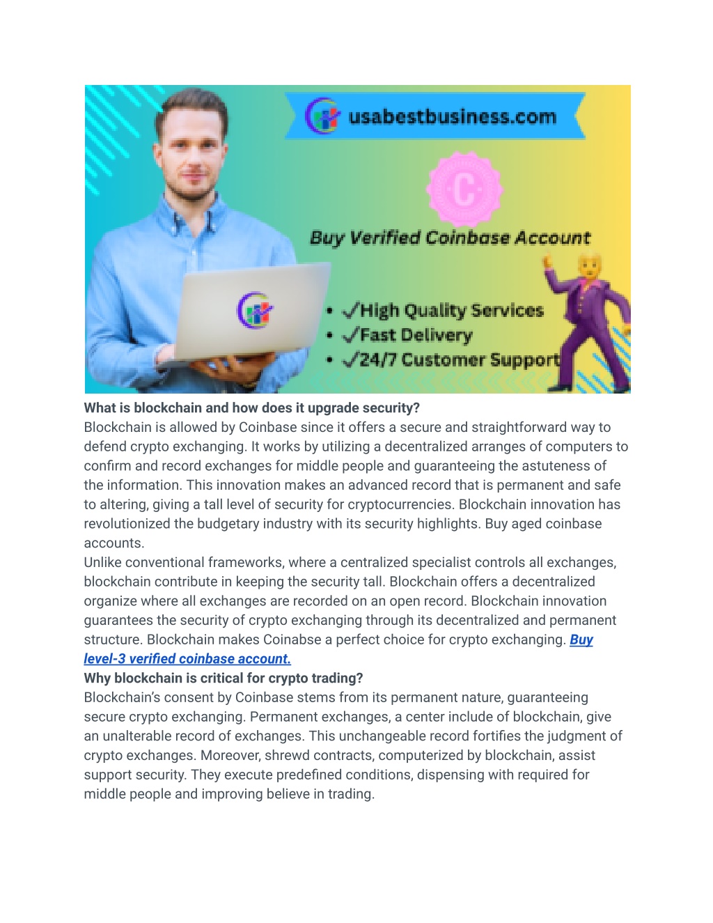 Buy Verified Coinbase Account<br>If you are ready to buy level-3 verified coinbase accounts at the cheap price, usabestbusiness.com could be your best choice. We provide best quality accounts and also provide all documents with the access. So to buy aged coinbase accounts USA or new one, place your order.