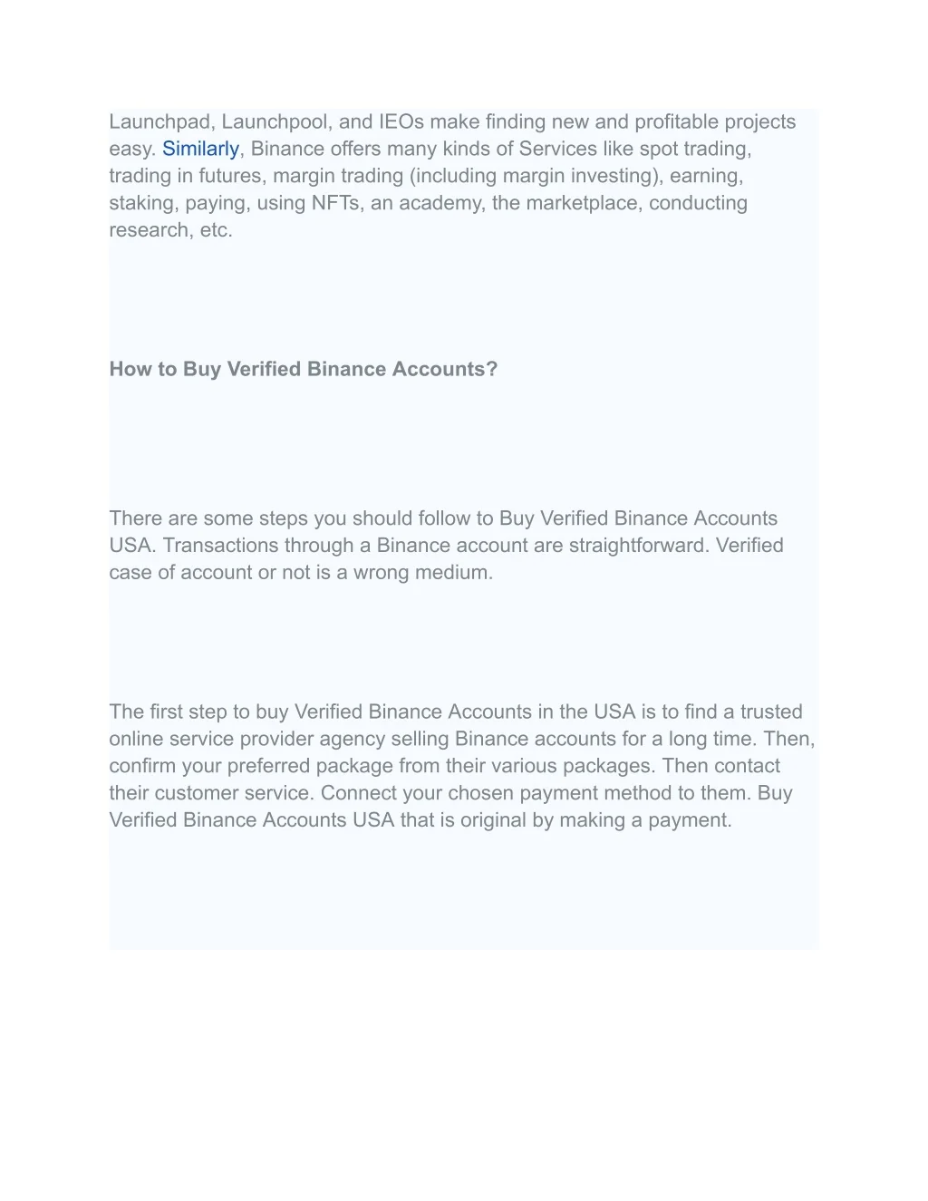 Buy Verified Binance Accounts - Secure and Ready for Trading Binance is a widely used transaction platform for cryptocurrency and other transactions. In buying anything, we should buy from the best place. And when purchasing such an essential account like Binance, buying from the best place is necessary. Because of modernity, fraud circles are becoming more active day by day. There are many online sites where you can buy a Binance account but never get complete satisfaction anywhere. There are even many sites where you can get scammed by Buy Verified Binance Accounts. So, before buying verified Binance Accounts, know the details about the seller and find the Best Place to Buy Verified Binance Accounts. For more service details 24/7-hours contact Email: contact.usareviewpro@gmail.com Telegram: @Usareviewpro Skype: UsaReviewPro WhatsApp: +1 (215) 307-7705