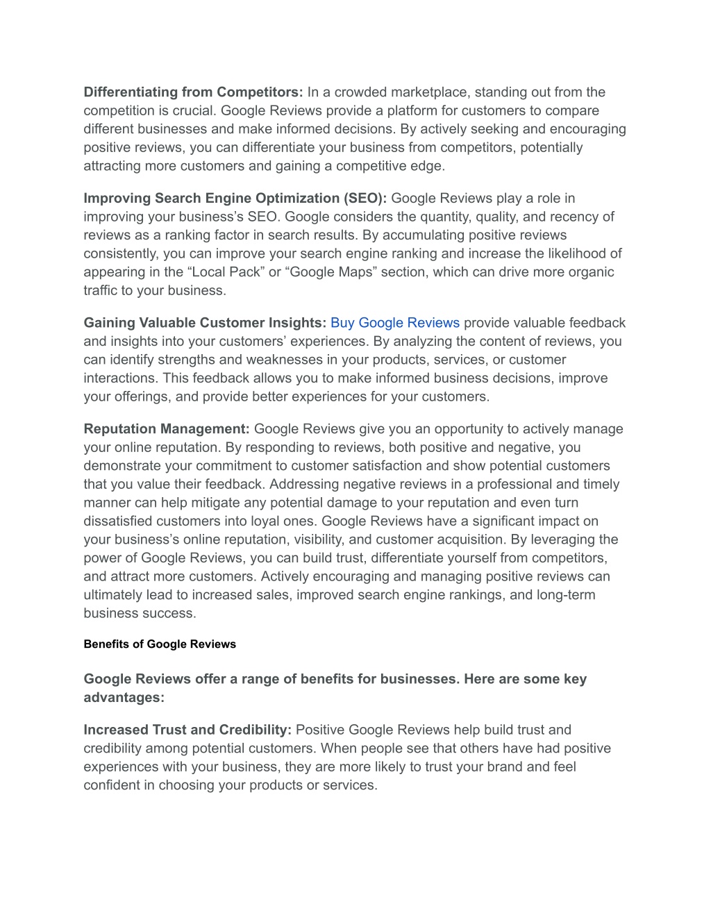 Differentiating from Competitors: In a crowded marketplace, standing out from the competition is crucial. Google Reviews provide a platform for customers to compare different businesses and make informed decisions. By actively seeking and encouraging positive reviews, you can differentiate your business from competitors, potentially attracting more customers and gaining a competitive edge. Improving Search Engine Optimization (SEO): Google Reviews play a role in improving your business’s SEO. Google considers the quantity, quality, and recency of reviews as a ranking factor in search results. By accumulating positive reviews consistently, you can improve your search engine ranking and increase the likelihood of appearing in the “Local Pack” or “Google Maps” section, which can drive more organic traffic to your business. Gaining Valuable Customer Insights: Buy Google Reviews provide valuable feedback and insights into your customers’ experiences. By analyzing the content of reviews, you can identify strengths and weaknesses in your products, services, or customer interactions. This feedback allows you to make informed business decisions, improve your offerings, and provide better experiences for your customers. Reputation Management: Google Reviews give you an opportunity to actively manage your online reputation. By responding to reviews, both positive and negative, you demonstrate your commitment to customer satisfaction and show potential customers that you value their feedback. Addressing negative reviews in a professional and timely manner can help mitigate any potential damage to your reputation and even turn dissatisfied customers into loyal ones. Google Reviews have a significant impact on your business’s online reputation, visibility, and customer acquisition. By leveraging the power of Google Reviews, you can build trust, differentiate yourself from competitors, and attract more customers. Actively encouraging and managing positive reviews can ultimately lead to increased sales, improved search engine rankings, and long-term business success. Benefits of Google Reviews Google Reviews offer a range of benefits for businesses. Here are some key advantages: Increased Trust and Credibility: Positive Google Reviews help build trust and credibility among potential customers. When people see that others have had positive experiences with your business, they are more likely to trust your brand and feel confident in choosing your products or services.