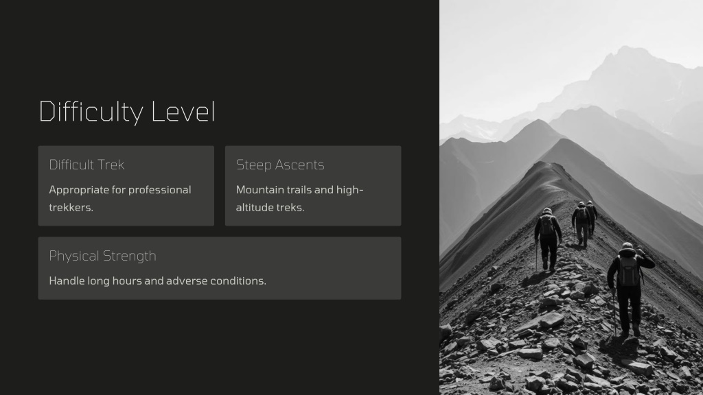Difficulty Level Difficult Trek Steep Ascents Appropriate for professional trekkers. Mountain trails and high-altitude treks. Physical Strength Handle long hours and adverse conditions.