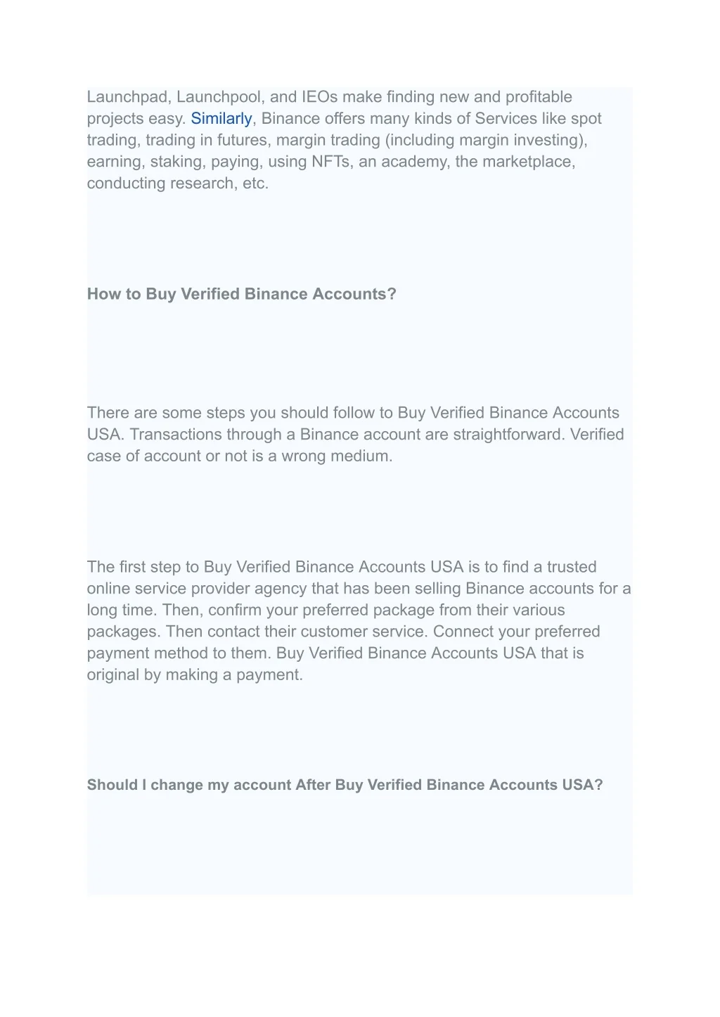 Launchpad, Launchpool, and IEOs make finding new and profitable projects easy. Similarly, Binance offers many kinds of Services like spot trading, trading in futures, margin trading (including margin investing), earning, staking, paying, using NFTs, an academy, the marketplace, conducting research, etc. How to Buy Verified Binance Accounts? There are some steps you should follow to Buy Verified Binance Accounts USA. Transactions through a Binance account are straightforward. Verified case of account or not is a wrong medium. The first step to Buy Verified Binance Accounts USA is to find a trusted online service provider agency that has been selling Binance accounts for a long time. Then, confirm your preferred package from their various packages. Then contact their customer service. Connect your preferred payment method to them. Buy Verified Binance Accounts USA that is original by making a payment. Should I change my account After Buy Verified Binance Accounts USA?