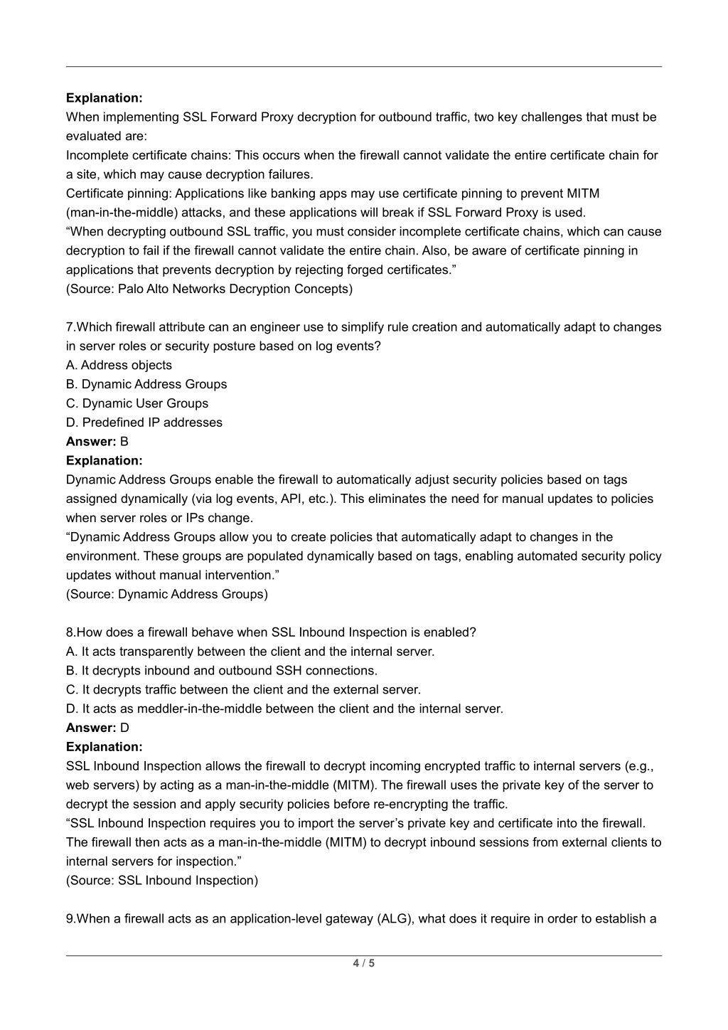 Explanation: When implementing SSL Forward Proxy decryption for outbound traffic, two key challenges that must be evaluated are: Incomplete certificate chains: This occurs when the firewall cannot validate the entire certificate chain for a site, which may cause decryption failures. Certificate pinning: Applications like banking apps may use certificate pinning to prevent MITM (man-in-the-middle) attacks, and these applications will break if SSL Forward Proxy is used. “When decrypting outbound SSL traffic, you must consider incomplete certificate chains, which can cause decryption to fail if the firewall cannot validate the entire chain. Also, be aware of certificate pinning in applications that prevents decryption by rejecting forged certificates.” (Source: Palo Alto Networks Decryption Concepts) 7.Which firewall attribute can an engineer use to simplify rule creation and automatically adapt to changes in server roles or security posture based on log events? A. Address objects B. Dynamic Address Groups C. Dynamic User Groups D. Predefined IP addresses Answer: B Explanation: Dynamic Address Groups enable the firewall to automatically adjust security policies based on tags assigned dynamically (via log events, API, etc.). This eliminates the need for manual updates to policies when server roles or IPs change. “Dynamic Address Groups allow you to create policies that automatically adapt to changes in the environment. These groups are populated dynamically based on tags, enabling automated security policy updates without manual intervention.” (Source: Dynamic Address Groups) 8.How does a firewall behave when SSL Inbound Inspection is enabled? A. It acts transparently between the client and the internal server. B. It decrypts inbound and outbound SSH connections. C. It decrypts traffic between the client and the external server. D. It acts as meddler-in-the-middle between the client and the internal server. Answer: D Explanation: SSL Inbound Inspection allows the firewall to decrypt incoming encrypted traffic to internal servers (e.g., web servers) by acting as a man-in-the-middle (MITM). The firewall uses the private key of the server to decrypt the session and apply security policies before re-encrypting the traffic. “SSL Inbound Inspection requires you to import the server’s private key and certificate into the firewall. The firewall then acts as a man-in-the-middle (MITM) to decrypt inbound sessions from external clients to internal servers for inspection.” (Source: SSL Inbound Inspection) 9.When a firewall acts as an application-level gateway (ALG), what does it require in order to establish a 4 / 5