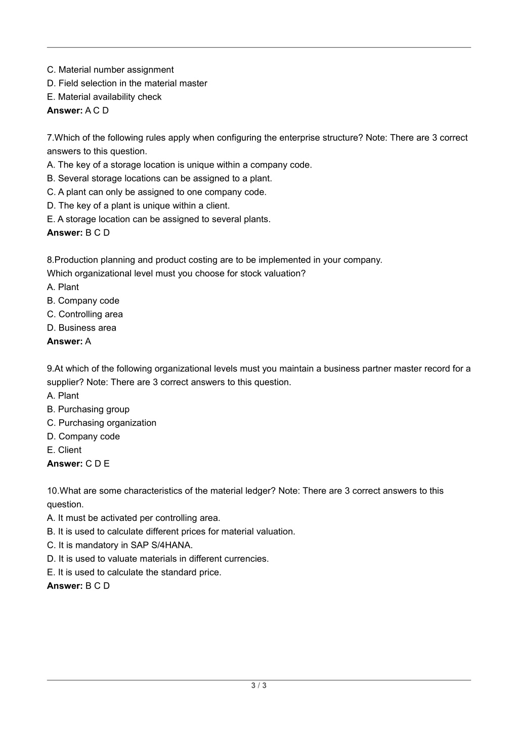 C. Material number assignment D. Field selection in the material master E. Material availability check Answer: A C D 7.Which of the following rules apply when configuring the enterprise structure? Note: There are 3 correct answers to this question. A. The key of a storage location is unique within a company code. B. Several storage locations can be assigned to a plant. C. A plant can only be assigned to one company code. D. The key of a plant is unique within a client. E. A storage location can be assigned to several plants. Answer: B C D 8.Production planning and product costing are to be implemented in your company. Which organizational level must you choose for stock valuation? A. Plant B. Company code C. Controlling area D. Business area Answer: A 9.At which of the following organizational levels must you maintain a business partner master record for a supplier? Note: There are 3 correct answers to this question. A. Plant B. Purchasing group C. Purchasing organization D. Company code E. Client Answer: C D E 10.What are some characteristics of the material ledger? Note: There are 3 correct answers to this question. A. It must be activated per controlling area. B. It is used to calculate different prices for material valuation. C. It is mandatory in SAP S/4HANA. D. It is used to valuate materials in different currencies. E. It is used to calculate the standard price. Answer: B C D 3 / 3