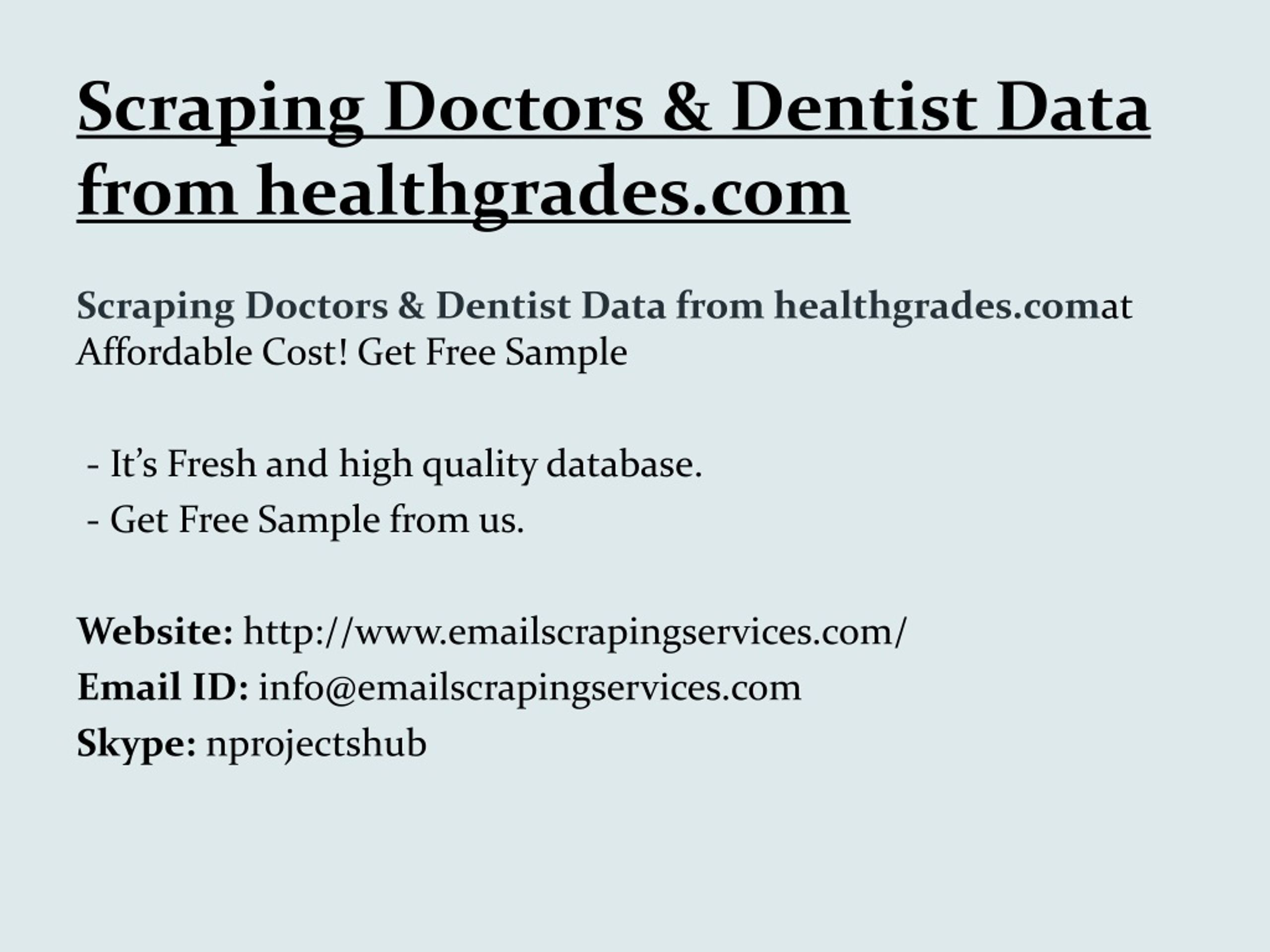 Scraping Doctors & Dentist Data from healthgrades.com Scraping Doctors & Dentist Data from healthgrades.comat Affordable Cost! Get Free Sample - It’s Fresh and high quality database. - Get Free Sample from us. Website: http://www.emailscrapingservices.com/ Email ID: info@emailscrapingservices.com Skype:nprojectshub