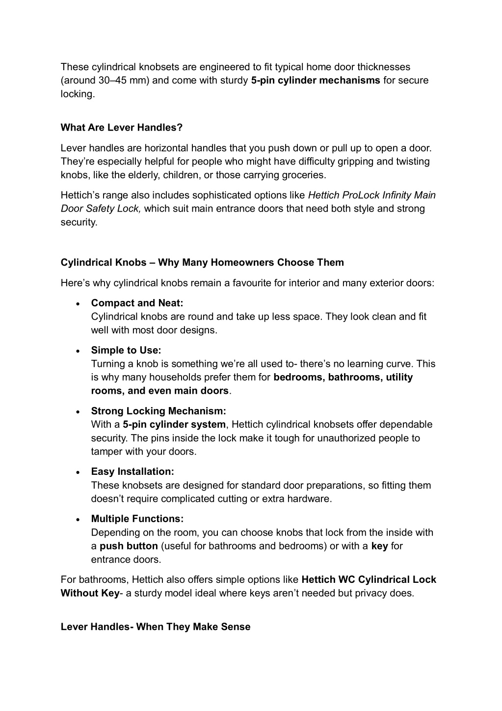 These cylindrical knobsets are engineered to fit typical home door thicknesses (around 30–45 mm) and come with sturdy 5-pin cylinder mechanisms for secure locking. What Are Lever Handles? Lever handles are horizontal handles that you push down or pull up to open a door. They’re especially helpful for people who might have difficulty gripping and twisting knobs, like the elderly, children, or those carrying groceries. Hettich’s range also includes sophisticated options like Hettich ProLock Infinity Main Door Safety Lock, which suit main entrance doors that need both style and strong security. Cylindrical Knobs – Why Many Homeowners Choose Them Here’s why cylindrical knobs remain a favourite for interior and many exterior doors: Compact and Neat: Cylindrical knobs are round and take up less space. They look clean and fit well with most door designs. Simple to Use: Turning a knob is something we’re all used to- there’s no learning curve. This is why many households prefer them for bedrooms, bathrooms, utility rooms, and even main doors. Strong Locking Mechanism: With a 5-pin cylinder system, Hettich cylindrical knobsets offer dependable security. The pins inside the lock make it tough for unauthorized people to tamper with your doors. Easy Installation: These knobsets are designed for standard door preparations, so fitting them doesn’t require complicated cutting or extra hardware. Multiple Functions: Depending on the room, you can choose knobs that lock from the inside with a push button (useful for bathrooms and bedrooms) or with a key for entrance doors. For bathrooms, Hettich also offers simple options like Hettich WC Cylindrical Lock Without Key- a sturdy model ideal where keys aren’t needed but privacy does. Lever Handles- When They Make Sense