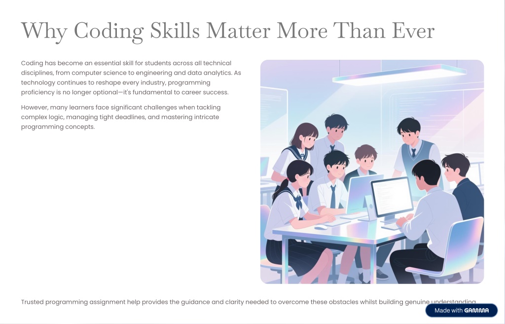 Why Coding Skills Matter More Than Ever Coding has become an essential skill for students across all technical disciplines, from computer science to engineering and data analytics. As technology continues to reshape every industry, programming proficiency is no longer optional—it's fundamental to career success. However, many learners face significant challenges when tackling complex logic, managing tight deadlines, and mastering intricate programming concepts. Trusted programming assignment help provides the guidance and clarity needed to overcome these obstacles whilst building genuine understanding.