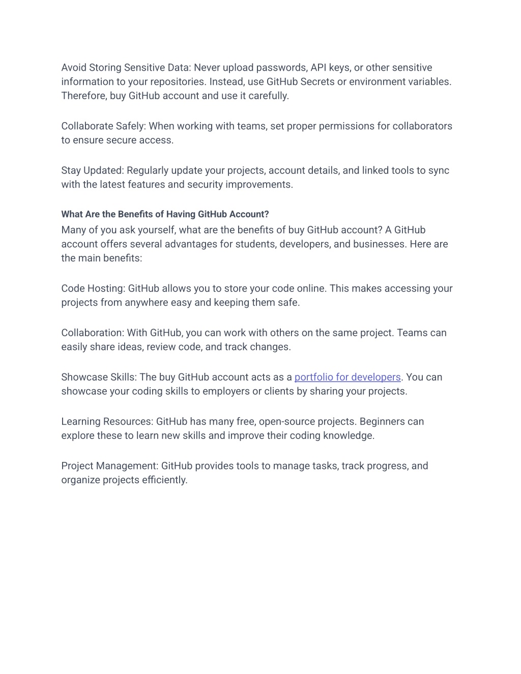Avoid Storing Sensitive Data: Never upload passwords, API keys, or other sensitive information to your repositories. Instead, use GitHub Secrets or environment variables. Therefore, buy GitHub account and use it carefully. Collaborate Safely: When working with teams, set proper permissions for collaborators to ensure secure access. Stay Updated: Regularly update your projects, account details, and linked tools to sync with the latest features and security improvements. What Are the Benefits of Having GitHub Account? Many of you ask yourself, what are the benefits of buy GitHub account? A GitHub account offers several advantages for students, developers, and businesses. Here are the main benefits: Code Hosting: GitHub allows you to store your code online. This makes accessing your projects from anywhere easy and keeping them safe. Collaboration: With GitHub, you can work with others on the same project. Teams can easily share ideas, review code, and track changes. Showcase Skills: The buy GitHub account acts as a portfolio for developers. You can showcase your coding skills to employers or clients by sharing your projects. Learning Resources: GitHub has many free, open-source projects. Beginners can explore these to learn new skills and improve their coding knowledge. Project Management: GitHub provides tools to manage tasks, track progress, and organize projects efficiently.