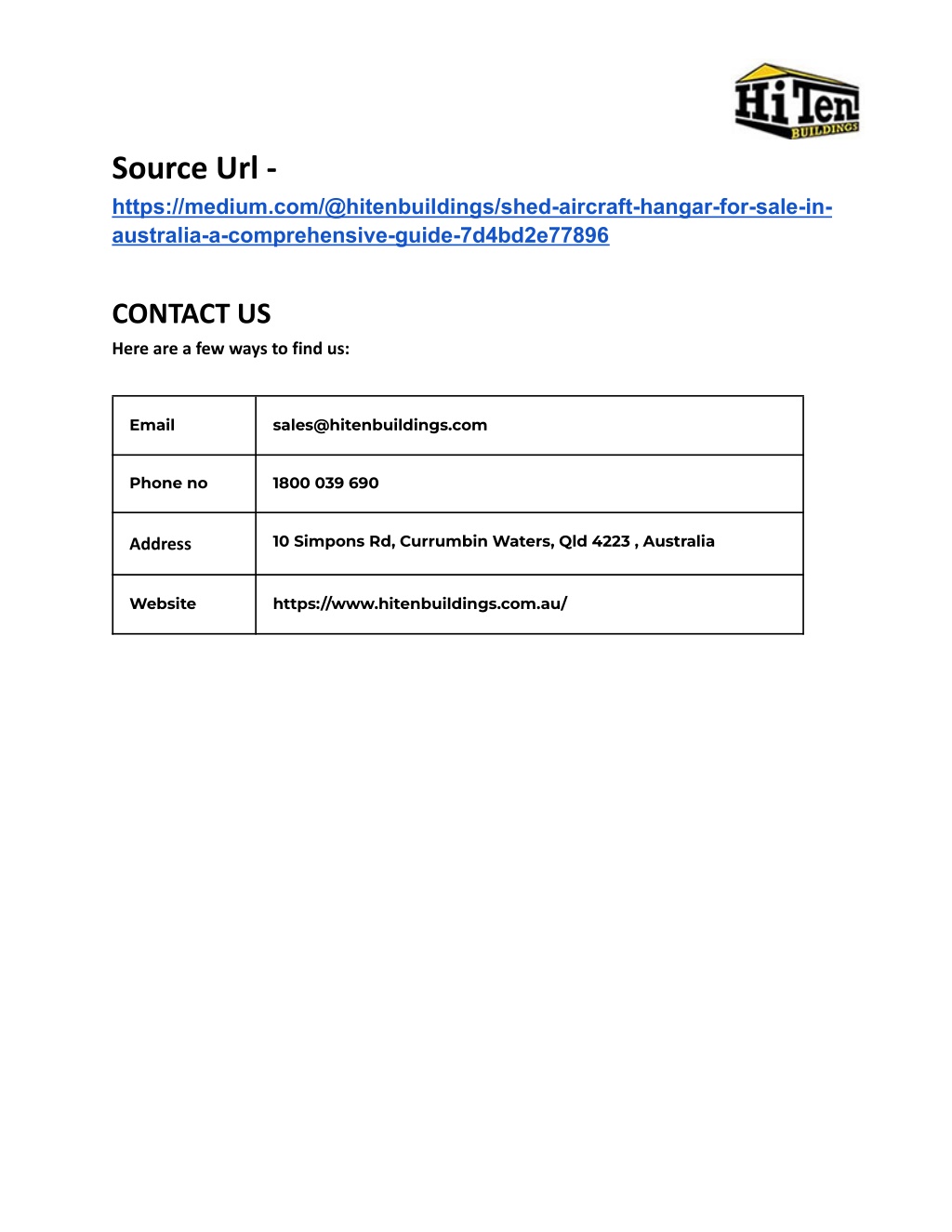 Source Url - https://medium.com/@hitenbuildings/shed-aircraft-hangar-for-sale-in- australia-a-comprehensive-guide-7d4bd2e77896 CONTACT US Here are a few ways to find us: Email sales@hitenbuildings.com Phone no 1800 039 690 10 Simpons Rd, Currumbin Waters, Qld 4223 , Australia Address Website https://www.hitenbuildings.com.au/