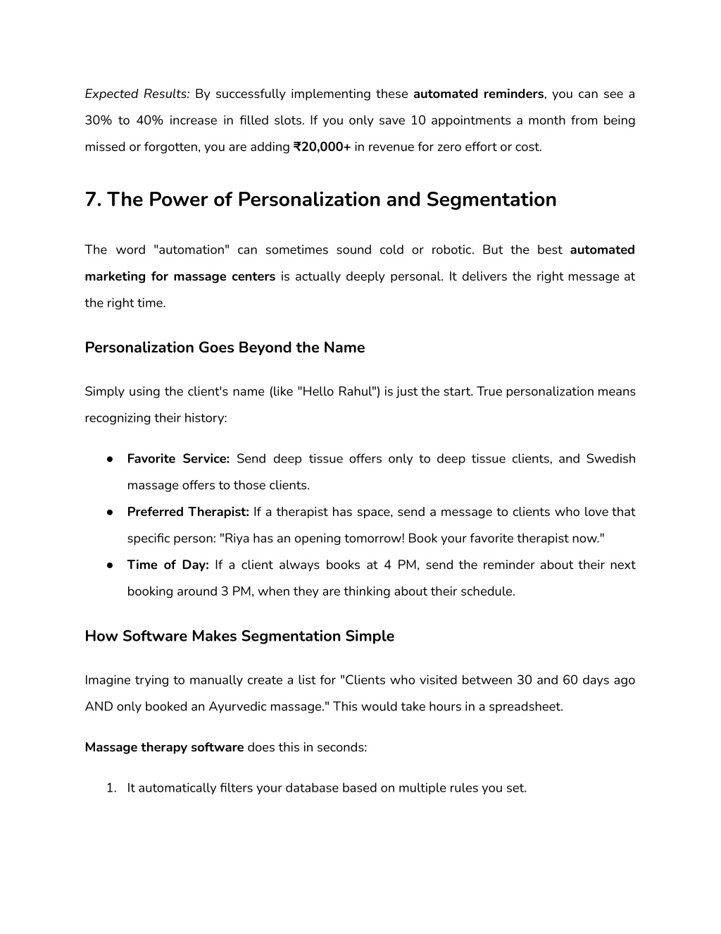 Expected Results: By successfully implementing these automated reminders, you can see a 30% to 40% increase in filled slots. If you only save 10 appointments a month from being missed or forgotten, you are adding ₹20,000+ in revenue for zero effort or cost. 7. The Power of Personalization and Segmentation The word "automation" can sometimes sound cold or robotic. But the best automated marketing for massage centers is actually deeply personal. It delivers the right message at the right time. Personalization Goes Beyond the Name Simply using the client's name (like "Hello Rahul") is just the start. True personalization means recognizing their history: ● Favorite Service: Send deep tissue offers only to deep tissue clients, and Swedish massage offers to those clients. ● Preferred Therapist: If a therapist has space, send a message to clients who love that specific person: "Riya has an opening tomorrow! Book your favorite therapist now." ● Time of Day: If a client always books at 4 PM, send the reminder about their next booking around 3 PM, when they are thinking about their schedule. How Software Makes Segmentation Simple Imagine trying to manually create a list for "Clients who visited between 30 and 60 days ago AND only booked an Ayurvedic massage." This would take hours in a spreadsheet. Massage therapy software does this in seconds: 1. It automatically filters your database based on multiple rules you set.