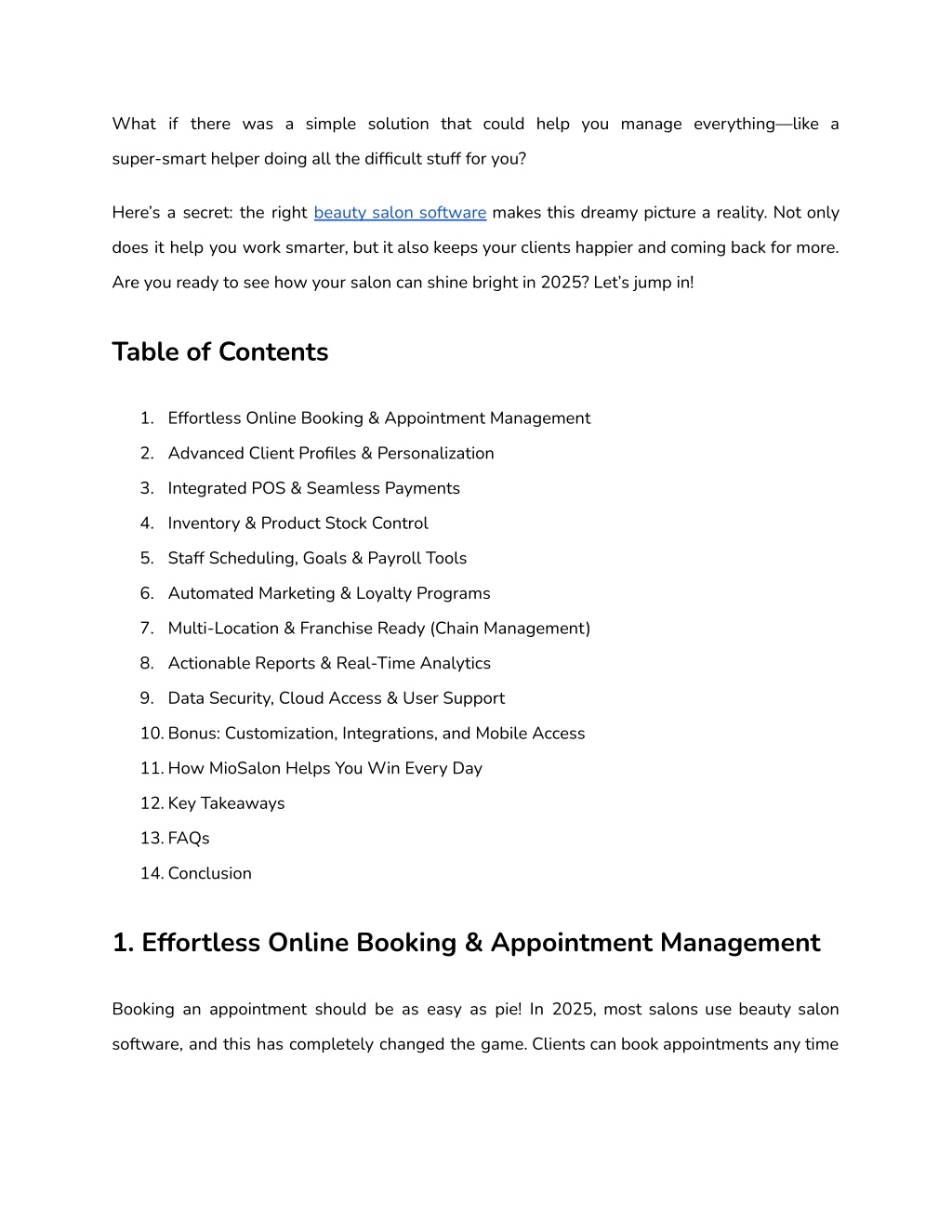MioSalon turns your salon from “kind of organised” into a well-oiled, happy machine. 12. Key Takeaways ● Smart salon software turns stressful days into smooth, easy ones. ● Clients love online booking, personal attention, and fast checkout. ● Features like inventory, staff management, and real reports save time and grow your business. ● Marketing, scheduling, and even payroll become easy, so you focus on what you love. 13. FAQs Q: How does salon software help manage appointments and stop no-shows? A: Booking, reminders, and waitlists are reached with a few easy clicks—clients stay in the loop and always show up! Q: Can one system run staff, sales, and inventory? A: Yes! Good beauty salon software manages rosters, sales, product stock, and payroll together. Q: Is it possible to run more than one salon location easily? A: Absolutely! Top software connects all salons and makes central management simple. Q: Is my client's info and data safe using the software? A: Cloud systems keep everything secure and backed up, following all the latest privacy rules. Q: What if I need help after purchasing? A: Trustworthy brands (like MioSalon) have real people ready to chat by phone, email, or live chat, and send updates regularly. 14. Conclusion