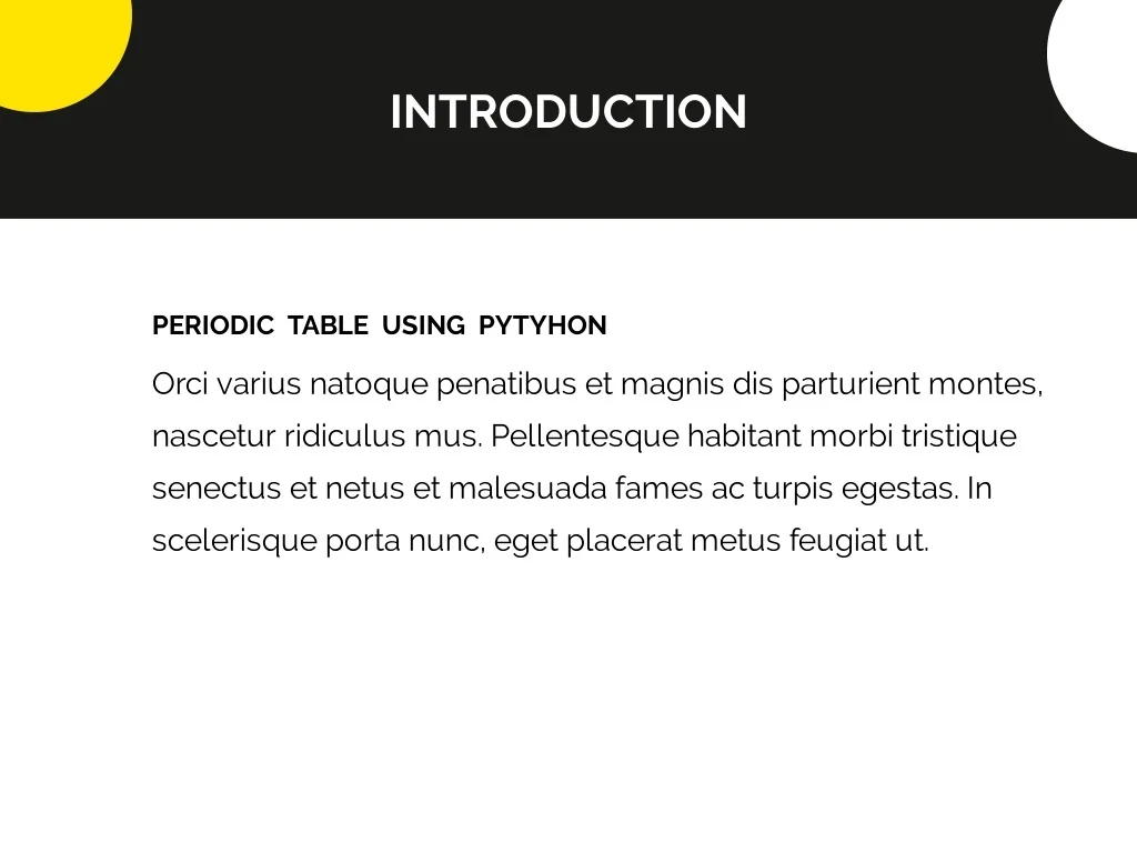 INTRODUCTION PERIODIC TABLE USING PYTYHON Orci varius natoque penatibus et magnis dis parturient montes, nascetur ridiculus mus. Pellentesque habitant morbi tristique senectus et netus et malesuada fames ac turpis egestas. In scelerisque porta nunc, eget placerat metus feugiat ut.