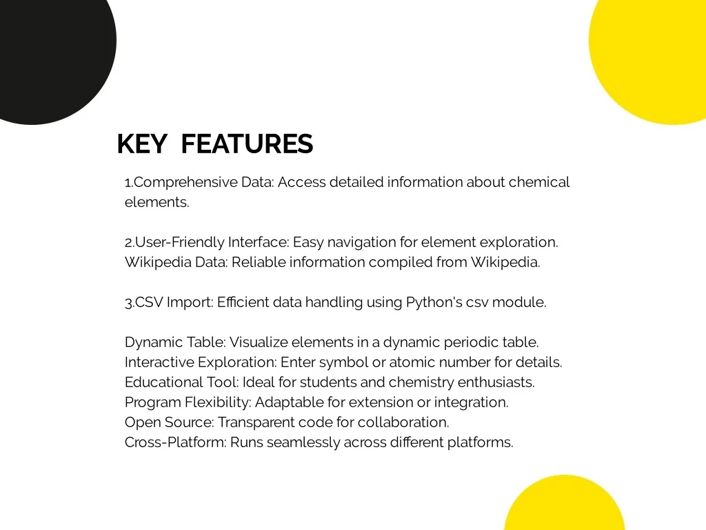KEY FEATURES 1.Comprehensive Data: Access detailed information about chemical elements. 2.User-Friendly Interface: Easy navigation for element exploration. Wikipedia Data: Reliable information compiled from Wikipedia. 3.CSV Import: Efficient data handling using Python's csv module. Dynamic Table: Visualize elements in a dynamic periodic table. Interactive Exploration: Enter symbol or atomic number for details. Educational Tool: Ideal for students and chemistry enthusiasts. Program Flexibility: Adaptable for extension or integration. Open Source: Transparent code for collaboration. Cross-Platform: Runs seamlessly across different platforms.