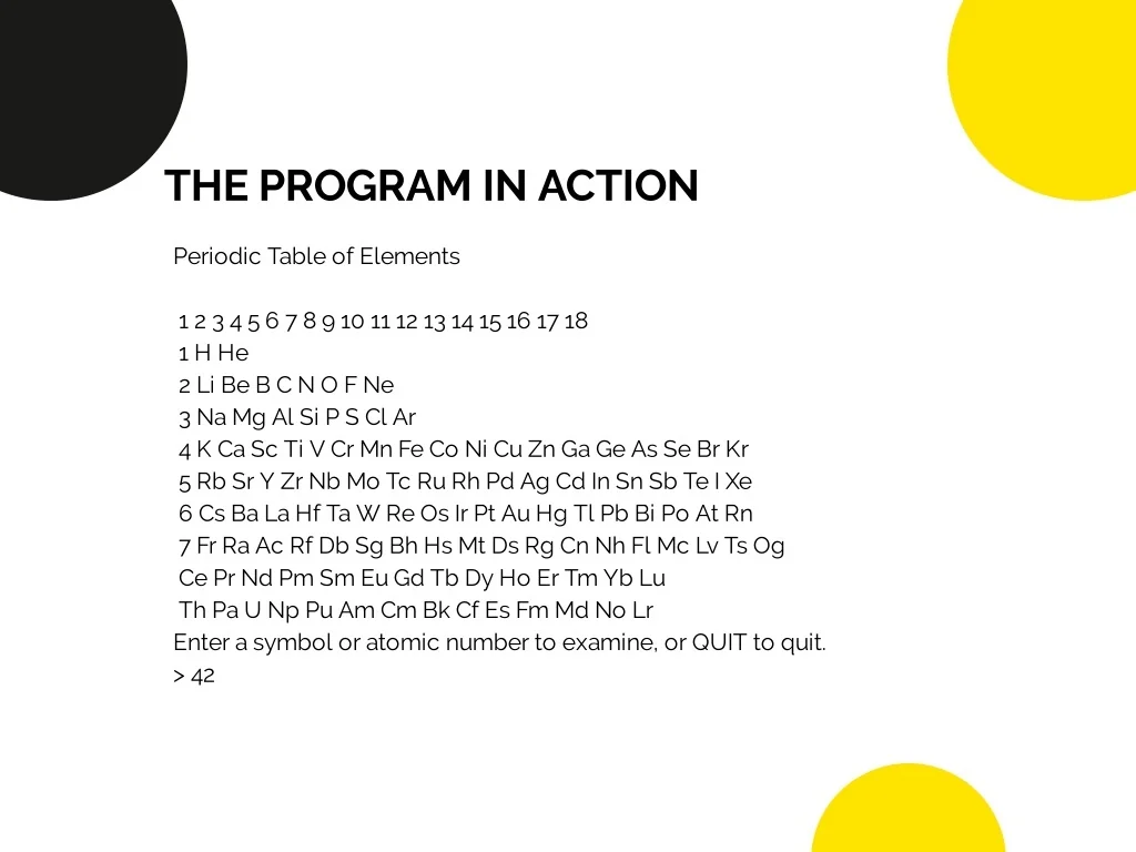 THE PROGRAM IN ACTION Periodic Table of Elements 1 2 3 4 5 6 7 8 9 10 11 12 13 14 15 16 17 18 1 H He 2 Li Be B C N O F Ne 3 Na Mg Al Si P S Cl Ar 4 K Ca Sc Ti V Cr Mn Fe Co Ni Cu Zn Ga Ge As Se Br Kr 5 Rb Sr Y Zr Nb Mo Tc Ru Rh Pd Ag Cd In Sn Sb Te I Xe 6 Cs Ba La Hf Ta W Re Os Ir Pt Au Hg Tl Pb Bi Po At Rn 7 Fr Ra Ac Rf Db Sg Bh Hs Mt Ds Rg Cn Nh Fl Mc Lv Ts Og Ce Pr Nd Pm Sm Eu Gd Tb Dy Ho Er Tm Yb Lu Th Pa U Np Pu Am Cm Bk Cf Es Fm Md No Lr Enter a symbol or atomic number to examine, or QUIT to quit. > 42
