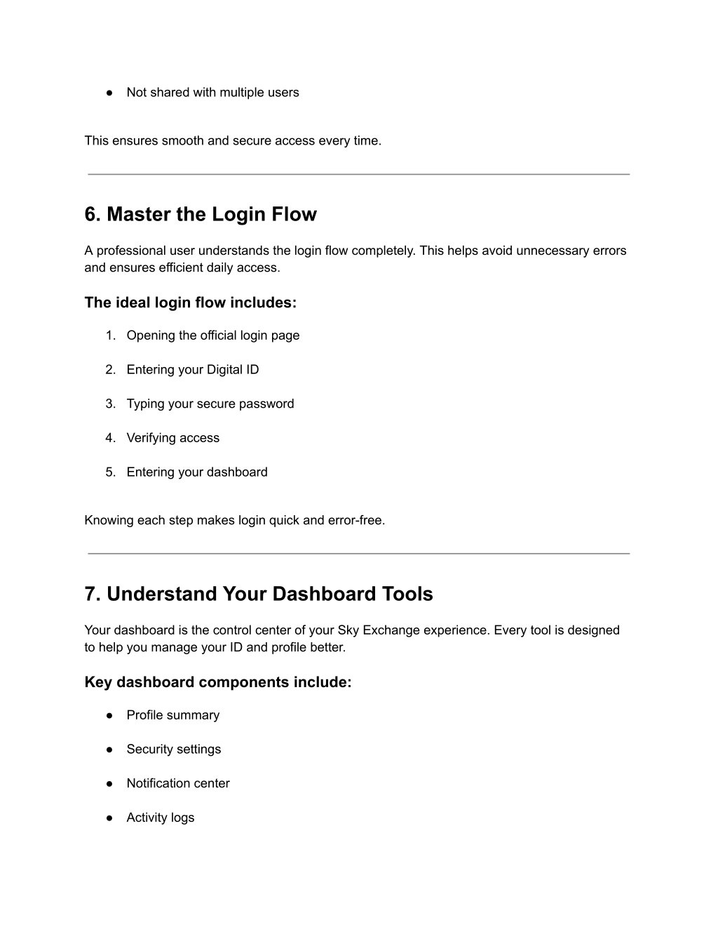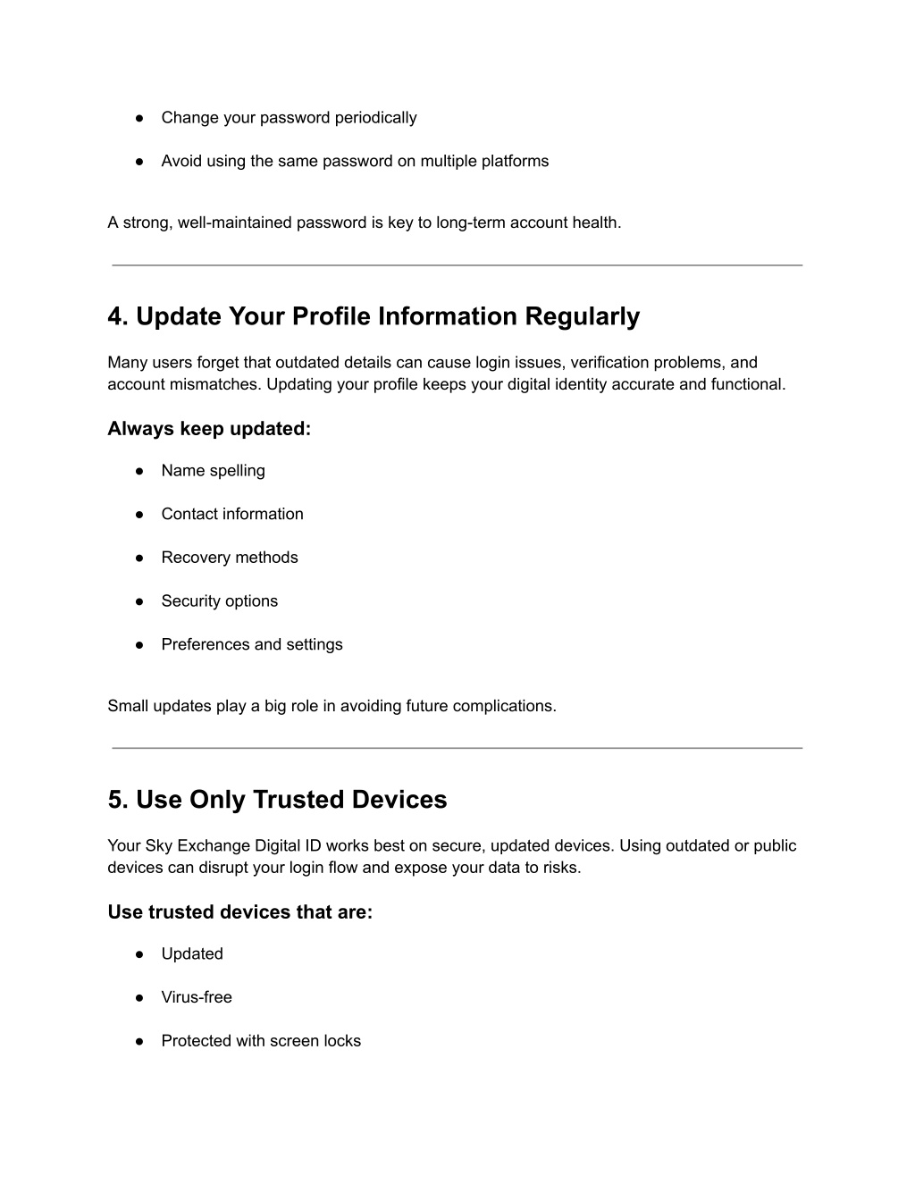 ● Change your password periodically ● Avoid using the same password on multiple platforms A strong, well-maintained password is key to long-term account health. 4. Update Your Profile Information Regularly Many users forget that outdated details can cause login issues, verification problems, and account mismatches. Updating your profile keeps your digital identity accurate and functional. Always keep updated: ● Name spelling ● Contact information ● Recovery methods ● Security options ● Preferences and settings Small updates play a big role in avoiding future complications. 5. Use Only Trusted Devices Your Sky Exchange Digital ID works best on secure, updated devices. Using outdated or public devices can disrupt your login flow and expose your data to risks. Use trusted devices that are: ● Updated ● Virus-free ● Protected with screen locks