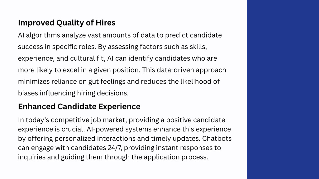 Improved Quality of Hires AI algorithms analyze vast amounts of data to predict candidate success in specific roles. By assessing factors such as skills, experience, and cultural fit, AI can identify candidates who are more likely to excel in a given position. This data-driven approach minimizes reliance on gut feelings and reduces the likelihood of biases influencing hiring decisions. Enhanced Candidate Experience In today’s competitive job market, providing a positive candidate experience is crucial. AI-powered systems enhance this experience by offering personalized interactions and timely updates. Chatbots can engage with candidates 24/7, providing instant responses to inquiries and guiding them through the application process.