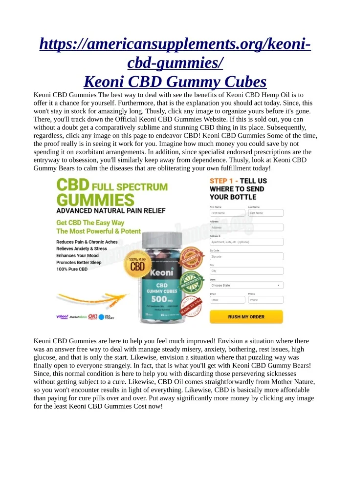 https://americansupplements.org/keoni- cbd-gummies/ Keoni CBD Gummy Cubes Keoni CBD Gummies The best way to deal with see the benefits of Keoni CBD Hemp Oil is to offer it a chance for yourself. Furthermore, that is the explanation you should act today. Since, this won't stay in stock for amazingly long. Thusly, click any image to organize yours before it's gone. There, you'll track down the Official Keoni CBD Gummies Website. If this is sold out, you can without a doubt get a comparatively sublime and stunning CBD thing in its place. Subsequently, regardless, click any image on this page to endeavor CBD! Keoni CBD Gummies Some of the time, the proof really is in seeing it work for you. Imagine how much money you could save by not spending it on exorbitant arrangements. In addition, since specialist endorsed prescriptions are the entryway to obsession, you'll similarly keep away from dependence. Thusly, look at Keoni CBD Gummy Bears to calm the diseases that are obliterating your own fulfillment today! Keoni CBD Gummies are here to help you feel much improved! Envision a situation where there was an answer free way to deal with manage steady misery, anxiety, bothering, rest issues, high glucose, and that is only the start. Likewise, envision a situation where that puzzling way was finally open to everyone strangely. In fact, that is what you'll get with Keoni CBD Gummy Bears! Since, this normal condition is here to help you with discarding those persevering sicknesses without getting subject to a cure. Likewise, CBD Oil comes straightforwardly from Mother Nature, so you won't encounter results in light of everything. Likewise, CBD is basically more affordable than paying for cure pills over and over. Put away significantly more money by clicking any image for the least Keoni CBD Gummies Cost now!