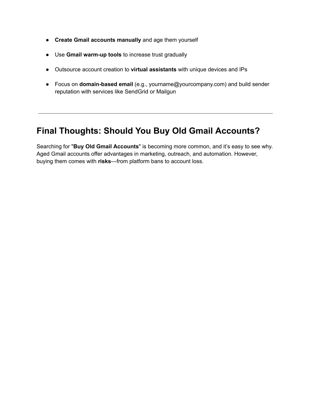 ● Create Gmail accounts manually and age them yourself ● Use Gmail warm-up tools to increase trust gradually ● Outsource account creation to virtual assistants with unique devices and IPs ● Focus on domain-based email (e.g., yourname@yourcompany.com) and build sender reputation with services like SendGrid or Mailgun Final Thoughts: Should You Buy Old Gmail Accounts? Searching for "Buy Old Gmail Accounts" is becoming more common, and it’s easy to see why. Aged Gmail accounts offer advantages in marketing, outreach, and automation. However, buying them comes with risks—from platform bans to account loss.