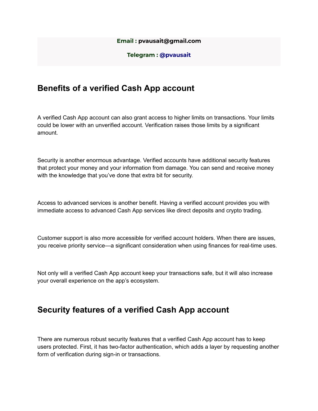 Email :pvausait@gmail.com Telegram :@pvausait Benefits of a verified Cash App account A verified Cash App account can also grant access to higher limits on transactions. Your limits could be lower with an unverified account. Verification raises those limits by a significant amount. Security is another enormous advantage. Verified accounts have additional security features that protect your money and your information from damage. You can send and receive money with the knowledge that you’ve done that extra bit for security. Access to advanced services is another benefit. Having a verified account provides you with immediate access to advanced Cash App services like direct deposits and crypto trading. Customer support is also more accessible for verified account holders. When there are issues, you receive priority service—a significant consideration when using finances for real-time uses. Not only will a verified Cash App account keep your transactions safe, but it will also increase your overall experience on the app’s ecosystem. Security features of a verified Cash App account There are numerous robust security features that a verified Cash App account has to keep users protected. First, it has two-factor authentication, which adds a layer by requesting another form of verification during sign-in or transactions.