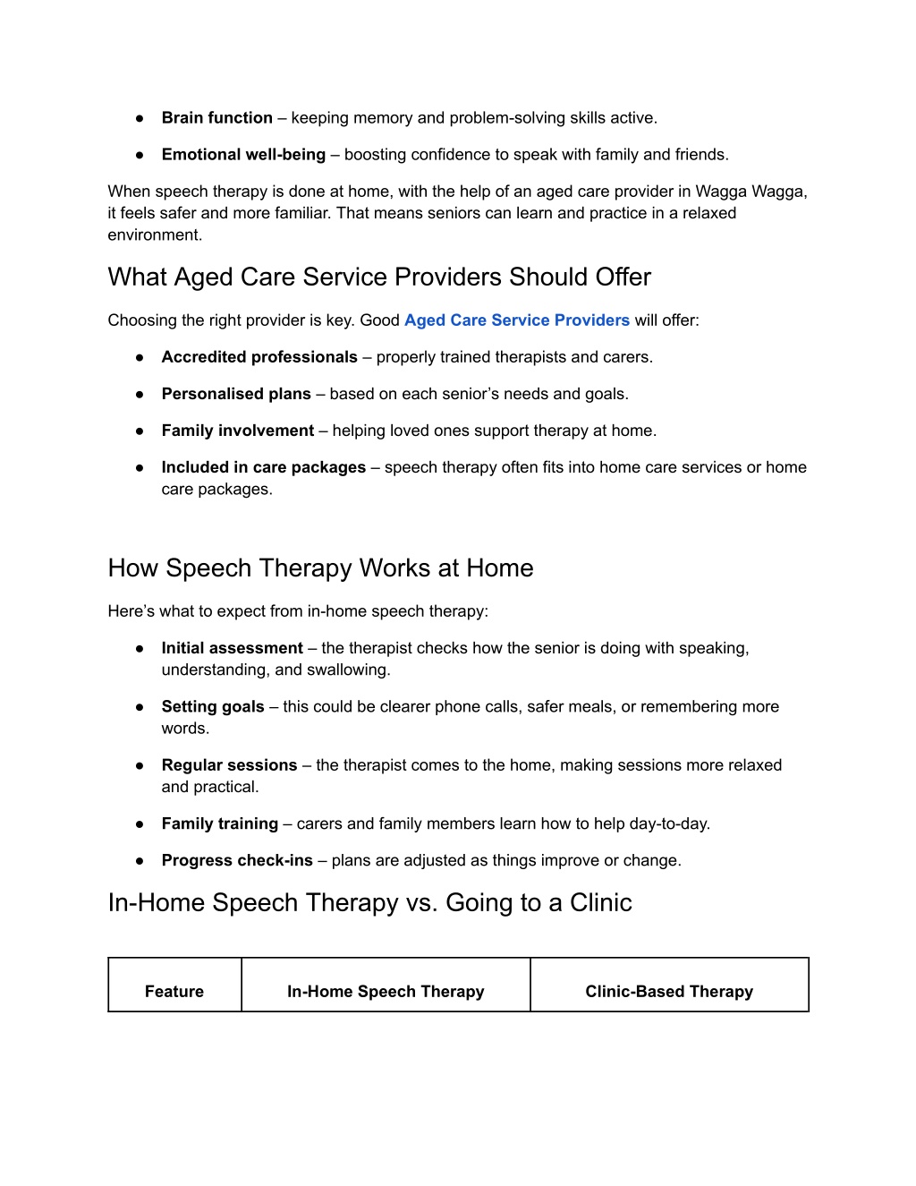 ● Brain function – keeping memory and problem-solving skills active. ● Emotional well-being – boosting confidence to speak with family and friends. When speech therapy is done at home, with the help of an aged care provider in Wagga Wagga, it feels safer and more familiar. That means seniors can learn and practice in a relaxed environment. What Aged Care Service Providers Should Offer Choosing the right provider is key. Good Aged Care Service Providers will offer: ● Accredited professionals – properly trained therapists and carers. ● Personalised plans – based on each senior’s needs and goals. ● Family involvement – helping loved ones support therapy at home. ● Included in care packages – speech therapy often fits into home care services or home care packages. How Speech Therapy Works at Home Here’s what to expect from in-home speech therapy: ● Initial assessment – the therapist checks how the senior is doing with speaking, understanding, and swallowing. ● Setting goals – this could be clearer phone calls, safer meals, or remembering more words. ● Regular sessions – the therapist comes to the home, making sessions more relaxed and practical. ● Family training – carers and family members learn how to help day-to-day. ● Progress check-ins – plans are adjusted as things improve or change. In-Home Speech Therapy vs. Going to a Clinic Feature In-Home Speech Therapy Clinic-Based Therapy
