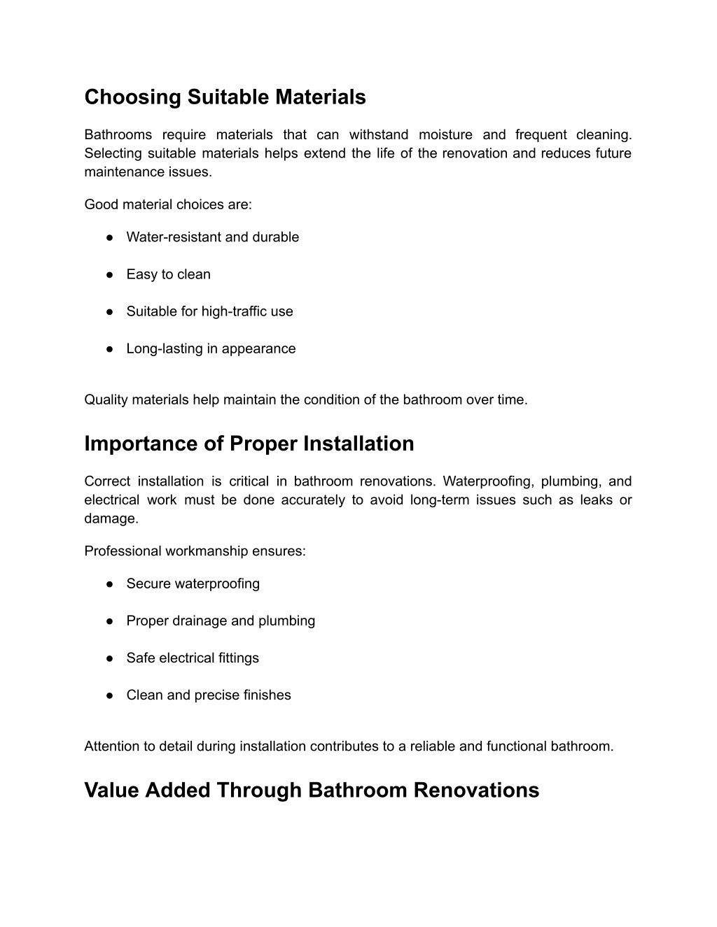 3. Choosing Suitable Materials Bathrooms require materials that can withstand moisture and frequent cleaning. Selecting suitable materials helps extend the life of the renovation and reduces future maintenance issues. Good material choices are: ● Water-resistant and durable ● Easy to clean ● Suitable for high-traffic use ● Long-lasting in appearance Quality materials help maintain the condition of the bathroom over time. Importance of Proper Installation Correct installation is critical in bathroom renovations. Waterproofing, plumbing, and electrical work must be done accurately to avoid long-term issues such as leaks or damage. Professional workmanship ensures: ● Secure waterproofing ● Proper drainage and plumbing ● Safe electrical fittings ● Clean and precise finishes Attention to detail during installation contributes to a reliable and functional bathroom. Value Added Through Bathroom Renovations