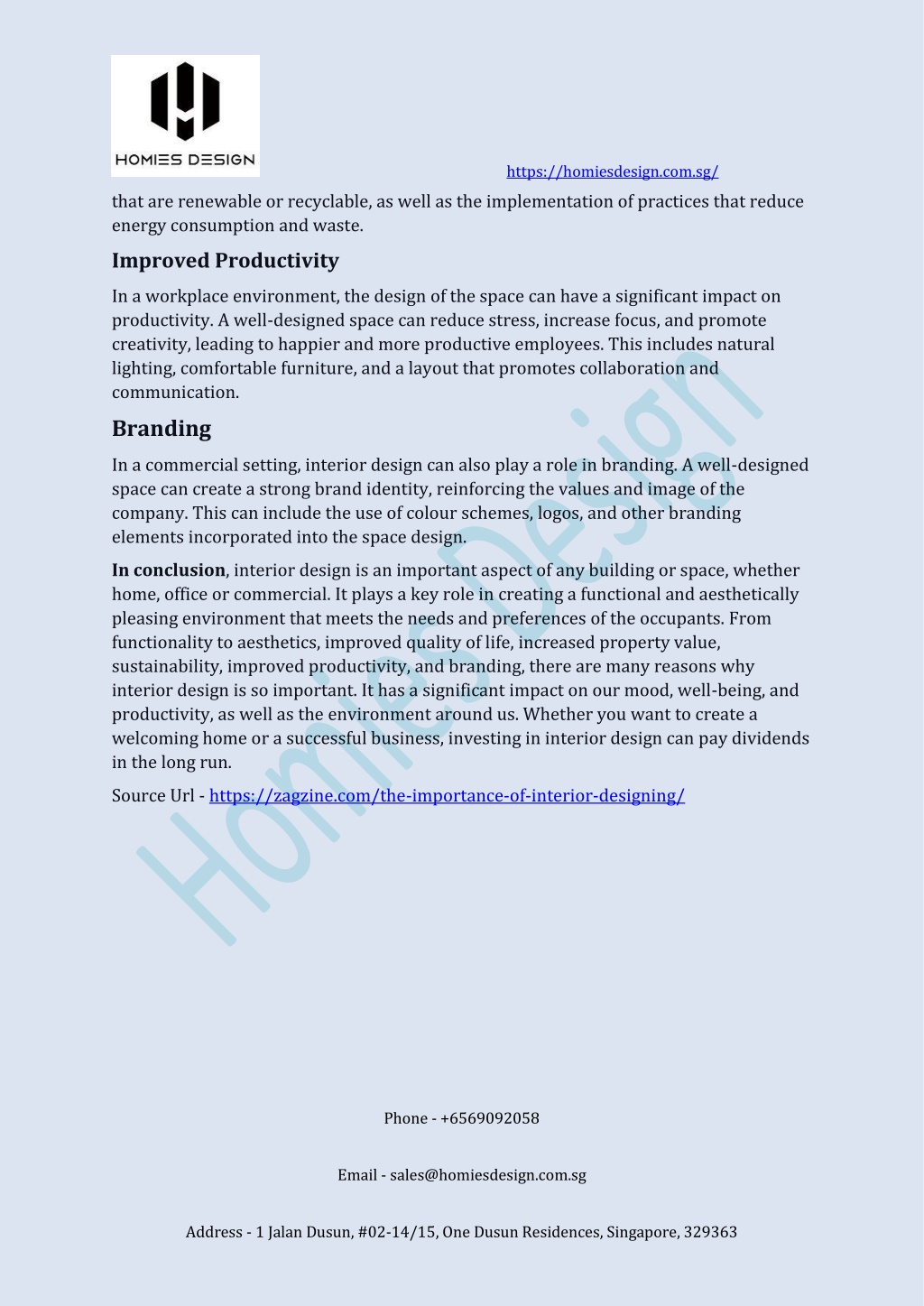 https://homiesdesign.com.sg/ that are renewable or recyclable, as well as the implementation of practices that reduce energy consumption and waste. Improved Productivity In a workplace environment, the design of the space can have a significant impact on productivity. A well-designed space can reduce stress, increase focus, and promote creativity, leading to happier and more productive employees. This includes natural lighting, comfortable furniture, and a layout that promotes collaboration and communication. Branding In a commercial setting, interior design can also play a role in branding. A well-designed space can create a strong brand identity, reinforcing the values and image of the company. This can include the use of colour schemes, logos, and other branding elements incorporated into the space design. In conclusion, interior design is an important aspect of any building or space, whether home, office or commercial. It plays a key role in creating a functional and aesthetically pleasing environment that meets the needs and preferences of the occupants. From functionality to aesthetics, improved quality of life, increased property value, sustainability, improved productivity, and branding, there are many reasons why interior design is so important. It has a significant impact on our mood, well-being, and productivity, as well as the environment around us. Whether you want to create a welcoming home or a successful business, investing in interior design can pay dividends in the long run. Source Url - https://zagzine.com/the-importance-of-interior-designing/ Phone - +6569092058 Email - sales@homiesdesign.com.sg Address - 1 Jalan Dusun, #02-14/15, One Dusun Residences, Singapore, 329363