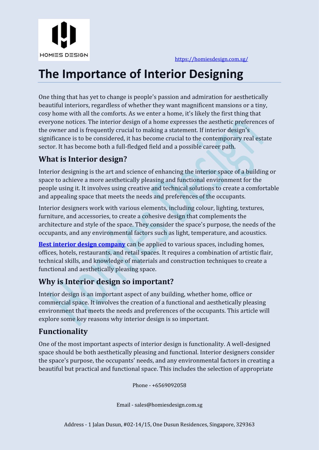 https://homiesdesign.com.sg/ The Importance of Interior Designing One thing that has yet to change is people's passion and admiration for aesthetically beautiful interiors, regardless of whether they want magnificent mansions or a tiny, cosy home with all the comforts. As we enter a home, it's likely the first thing that everyone notices. The interior design of a home expresses the aesthetic preferences of the owner and is frequently crucial to making a statement. If interior design's significance is to be considered, it has become crucial to the contemporary real estate sector. It has become both a full-fledged field and a possible career path. What is Interior design? Interior designing is the art and science of enhancing the interior space of a building or space to achieve a more aesthetically pleasing and functional environment for the people using it. It involves using creative and technical solutions to create a comfortable and appealing space that meets the needs and preferences of the occupants. Interior designers work with various elements, including colour, lighting, textures, furniture, and accessories, to create a cohesive design that complements the architecture and style of the space. They consider the space's purpose, the needs of the occupants, and any environmental factors such as light, temperature, and acoustics. Best interior design company can be applied to various spaces, including homes, offices, hotels, restaurants, and retail spaces. It requires a combination of artistic flair, technical skills, and knowledge of materials and construction techniques to create a functional and aesthetically pleasing space. Why is Interior design so important? Interior design is an important aspect of any building, whether home, office or commercial space. It involves the creation of a functional and aesthetically pleasing environment that meets the needs and preferences of the occupants. This article will explore some key reasons why interior design is so important. Functionality One of the most important aspects of interior design is functionality. A well-designed space should be both aesthetically pleasing and functional. Interior designers consider the space's purpose, the occupants' needs, and any environmental factors in creating a beautiful but practical and functional space. This includes the selection of appropriate Phone - +6569092058 Email - sales@homiesdesign.com.sg Address - 1 Jalan Dusun, #02-14/15, One Dusun Residences, Singapore, 329363