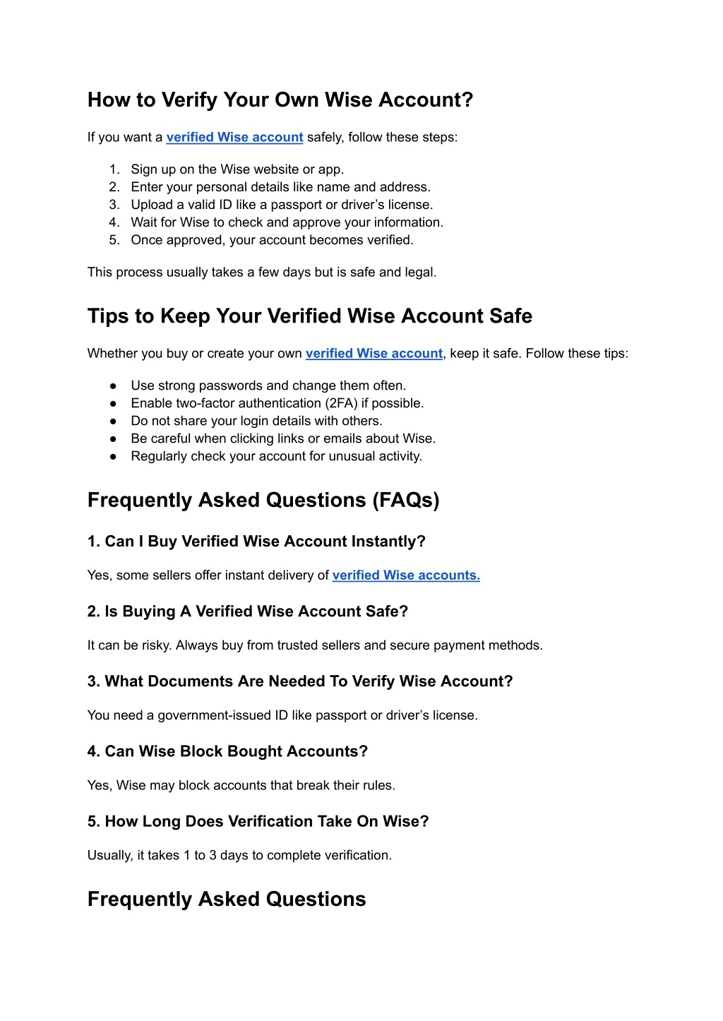 How to Verify Your Own Wise Account? If you want a verified Wise account safely, follow these steps: 1. Sign up on the Wise website or app. 2. Enter your personal details like name and address. 3. Upload a valid ID like a passport or driver’s license. 4. Wait for Wise to check and approve your information. 5. Once approved, your account becomes verified. This process usually takes a few days but is safe and legal. Tips to Keep Your Verified Wise Account Safe Whether you buy or create your own verified Wise account, keep it safe. Follow these tips: ● Use strong passwords and change them often. ● Enable two-factor authentication (2FA) if possible. ● Do not share your login details with others. ● Be careful when clicking links or emails about Wise. ● Regularly check your account for unusual activity. Frequently Asked Questions (FAQs) 1. Can I Buy Verified Wise Account Instantly? Yes, some sellers offer instant delivery of verified Wise accounts. 2. Is Buying A Verified Wise Account Safe? It can be risky. Always buy from trusted sellers and secure payment methods. 3. What Documents Are Needed To Verify Wise Account? You need a government-issued ID like passport or driver’s license. 4. Can Wise Block Bought Accounts? Yes, Wise may block accounts that break their rules. 5. How Long Does Verification Take On Wise? Usually, it takes 1 to 3 days to complete verification. Frequently Asked Questions