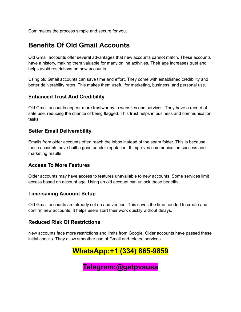 2. Com makes the process simple and secure for you. Benefits Of Old Gmail Accounts Old Gmail accounts offer several advantages that new accounts cannot match. These accounts have a history, making them valuable for many online activities. Their age increases trust and helps avoid restrictions on new accounts. Using old Gmail accounts can save time and effort. They come with established credibility and better deliverability rates. This makes them useful for marketing, business, and personal use. Enhanced Trust And Credibility Old Gmail accounts appear more trustworthy to websites and services. They have a record of safe use, reducing the chance of being flagged. This trust helps in business and communication tasks. Better Email Deliverability Emails from older accounts often reach the inbox instead of the spam folder. This is because these accounts have built a good sender reputation. It improves communication success and marketing results. Access To More Features Older accounts may have access to features unavailable to new accounts. Some services limit access based on account age. Using an old account can unlock these benefits. Time-saving Account Setup Old Gmail accounts are already set up and verified. This saves the time needed to create and confirm new accounts. It helps users start their work quickly without delays. Reduced Risk Of Restrictions New accounts face more restrictions and limits from Google. Older accounts have passed these initial checks. They allow smoother use of Gmail and related services. WhatsApp:+1 (334) 865-9859 Telegram:@getpvausa