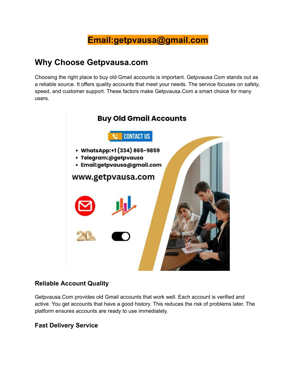 3. Email:getpvausa@gmail.com Why Choose Getpvausa.com Choosing the right place to buy old Gmail accounts is important. Getpvausa.Com stands out as a reliable source. It offers quality accounts that meet your needs. The service focuses on safety, speed, and customer support. These factors make Getpvausa.Com a smart choice for many users. Reliable Account Quality Getpvausa.Com provides old Gmail accounts that work well. Each account is verified and active. You get accounts that have a good history. This reduces the risk of problems later. The platform ensures accounts are ready to use immediately. Fast Delivery Service