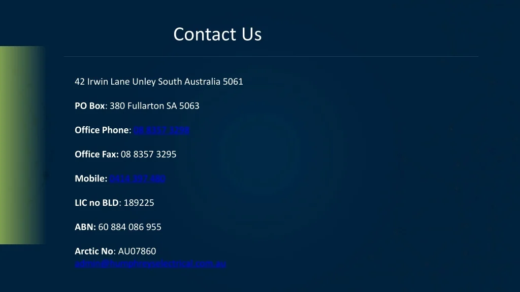 Contact Us 42 Irwin Lane Unley South Australia 5061 PO Box: 380 Fullarton SA 5063 Office Phone: 08 8357 3298 Office Fax: 08 8357 3295 Mobile: 0414 397 480 LIC no BLD: 189225 ABN: 60 884 086 955 Arctic No: AU07860 admin@humphreyselectrical.com.au