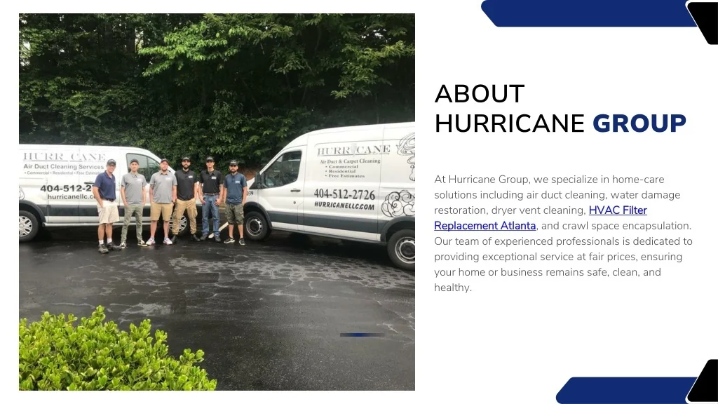 ABOUT HURRICANE GROUP At Hurricane Group, we specialize in home-care solutions including air duct cleaning, water damage restoration, dryer vent cleaning, HVAC Filter Replacement Atlanta, and crawl space encapsulation. Our team of experienced professionals is dedicated to providing exceptional service at fair prices, ensuring your home or business remains safe, clean, and healthy.