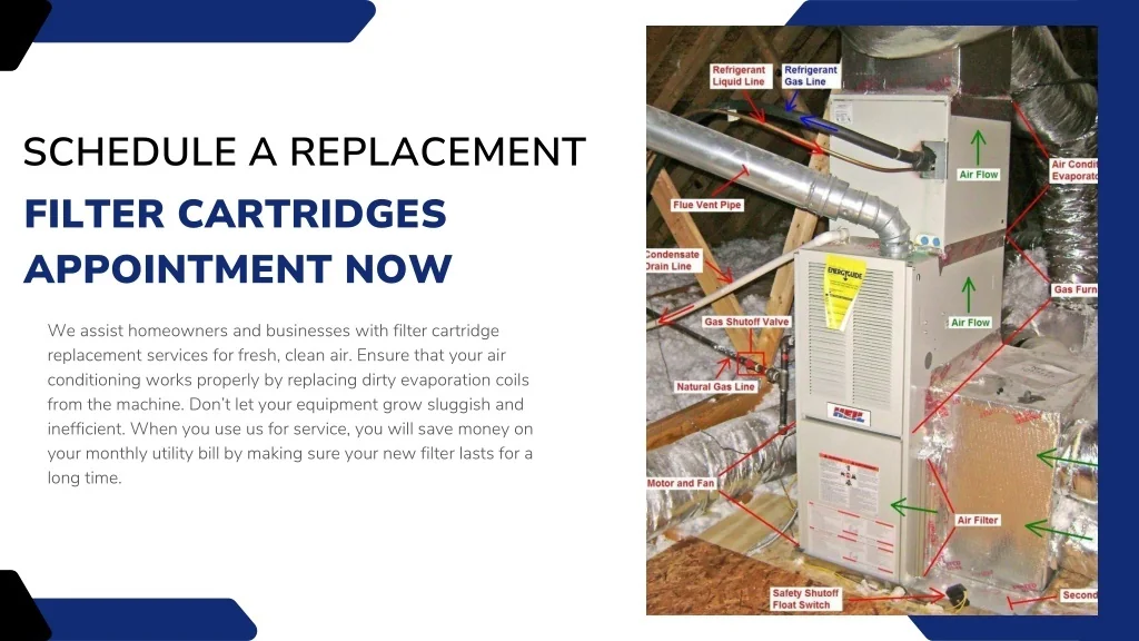 SCHEDULE A REPLACEMENT FILTER CARTRIDGES APPOINTMENT NOW We assist homeowners and businesses with filter cartridge replacement services for fresh, clean air. Ensure that your air conditioning works properly by replacing dirty evaporation coils from the machine. Don’t let your equipment grow sluggish and inefficient. When you use us for service, you will save money on your monthly utility bill by making sure your new filter lasts for a long time.