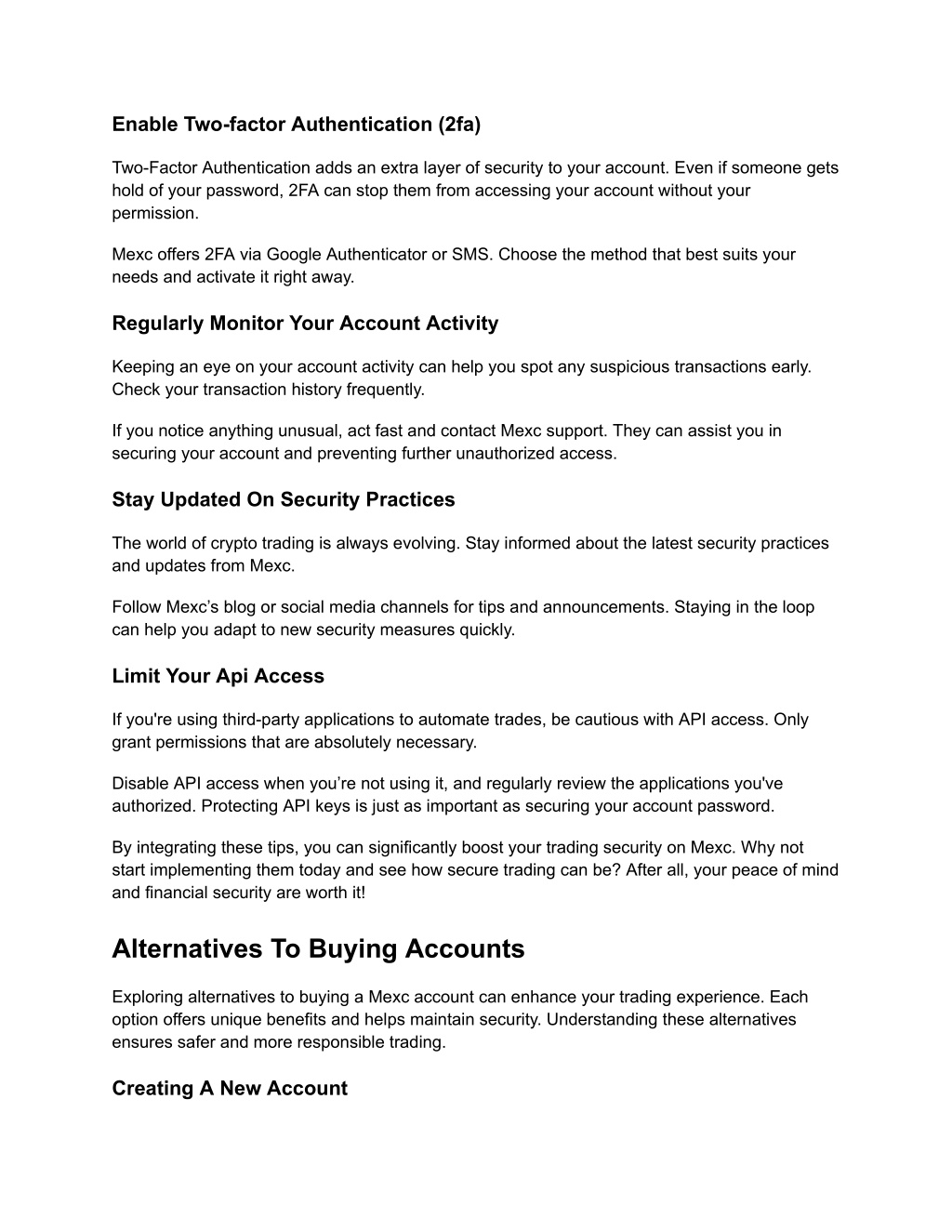 Enable Two-factor Authentication (2fa) Two-Factor Authentication adds an extra layer of security to your account. Even if someone gets hold of your password, 2FA can stop them from accessing your account without your permission. Mexc offers 2FA via Google Authenticator or SMS. Choose the method that best suits your needs and activate it right away. Regularly Monitor Your Account Activity Keeping an eye on your account activity can help you spot any suspicious transactions early. Check your transaction history frequently. If you notice anything unusual, act fast and contact Mexc support. They can assist you in securing your account and preventing further unauthorized access. Stay Updated On Security Practices The world of crypto trading is always evolving. Stay informed about the latest security practices and updates from Mexc. Follow Mexc’s blog or social media channels for tips and announcements. Staying in the loop can help you adapt to new security measures quickly. Limit Your Api Access If you're using third-party applications to automate trades, be cautious with API access. Only grant permissions that are absolutely necessary. Disable API access when you’re not using it, and regularly review the applications you've authorized. Protecting API keys is just as important as securing your account password. By integrating these tips, you can significantly boost your trading security on Mexc. Why not start implementing them today and see how secure trading can be? After all, your peace of mind and financial security are worth it! Alternatives To Buying Accounts Exploring alternatives to buying a Mexc account can enhance your trading experience. Each option offers unique benefits and helps maintain security. Understanding these alternatives ensures safer and more responsible trading. Creating A New Account