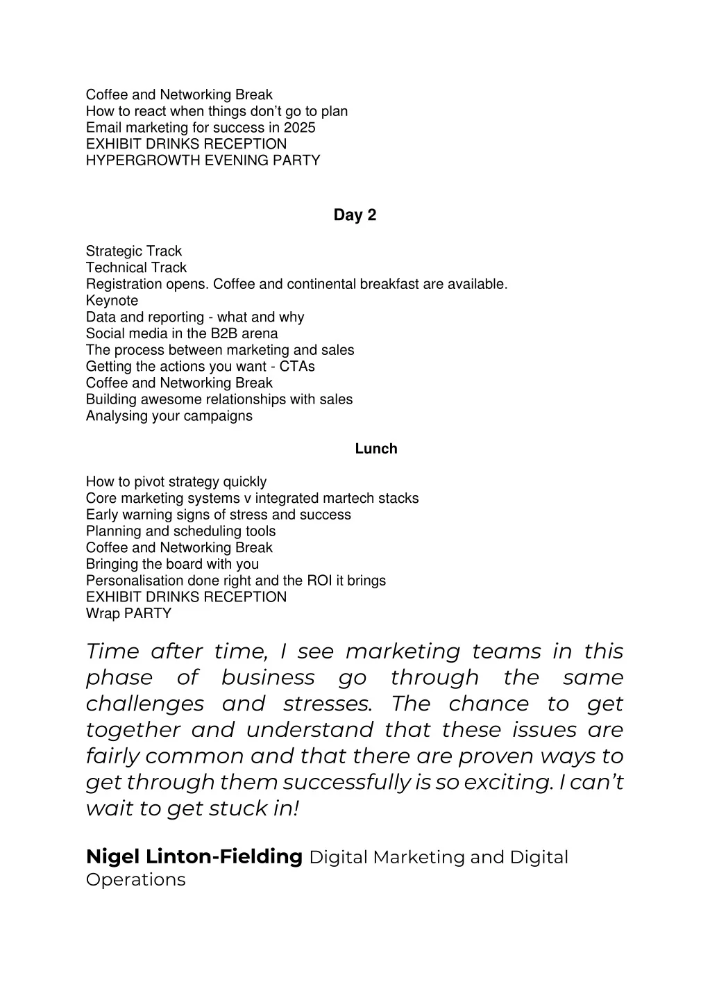 Coffee and Networking Break How to react when things don’t go to plan Email marketing for success in 2025 EXHIBIT DRINKS RECEPTION HYPERGROWTH EVENING PARTY Day 2 Strategic Track Technical Track Registration opens. Coffee and continental breakfast are available. Keynote Data and reporting - what and why Social media in the B2B arena The process between marketing and sales Getting the actions you want - CTAs Coffee and Networking Break Building awesome relationships with sales Analysing your campaigns Lunch How to pivot strategy quickly Core marketing systems v integrated martech stacks Early warning signs of stress and success Planning and scheduling tools Coffee and Networking Break Bringing the board with you Personalisation done right and the ROI it brings EXHIBIT DRINKS RECEPTION Wrap PARTY Time after time, I see marketing teams in this phase of business go through the same challenges and stresses. The chance to get together and understand that these issues are fairly common and that there are proven ways to get through them successfully is so exciting. I can’t wait to get stuck in! Nigel Linton-Fielding Digital Marketing and Digital Operations