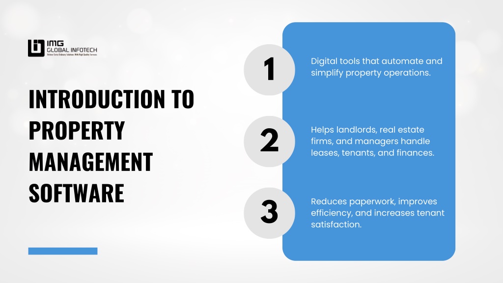 Digital tools that automate and simplify property operations. 1 INTRODUCTION TO PROPERTY MANAGEMENT SOFTWARE Helps landlords, real estate firms, and managers handle leases, tenants, and finances. 2 Reduces paperwork, improves efficiency, and increases tenant satisfaction. 3