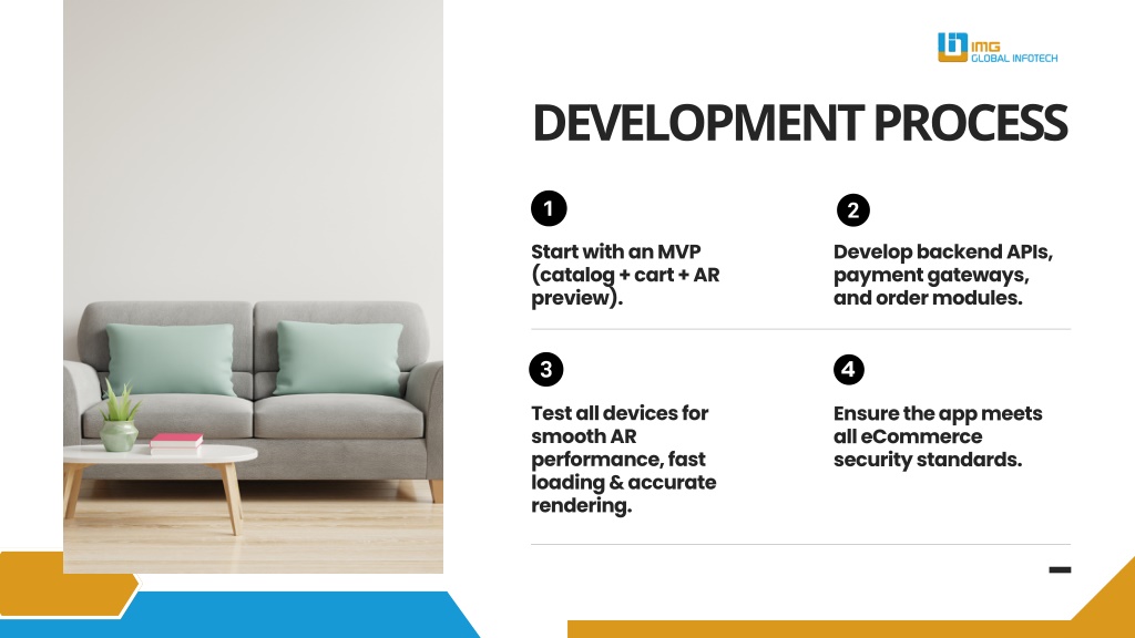 9. DEVELOPMENT PROCESS Start with an MVP (catalog + cart + AR preview). Develop backend APIs, payment gateways, and order modules. Test all devices for smooth AR performance, fast loading & accurate rendering. Ensure the app meets all eCommerce security standards.
