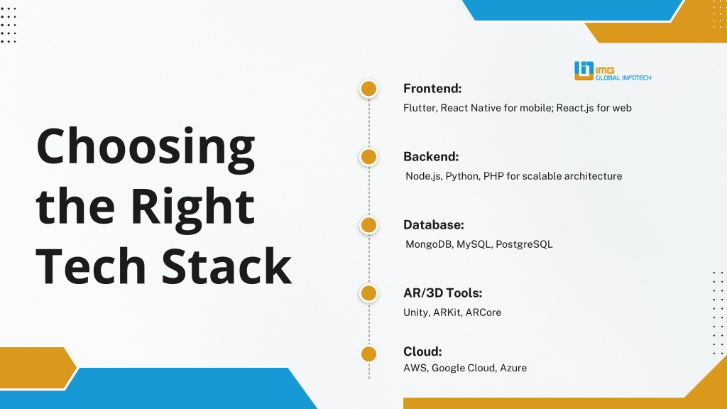 7. Frontend: Flutter, React Native for mobile; React.js for web Choosing the Right Tech Stack Backend: Node.js, Python, PHP for scalable architecture Database: MongoDB, MySQL, PostgreSQL AR/3D Tools: Unity, ARKit, ARCore Cloud: AWS, Google Cloud, Azure