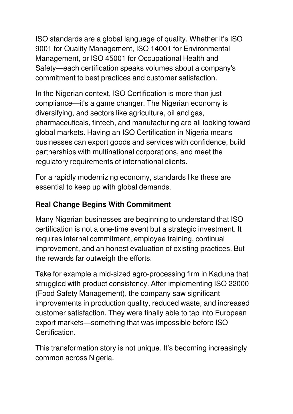 ISOstandardsareagloballanguageofquality.Whetherit’sISO 9001forQualityManagement,ISO14001forEnvironmental Management,orISO45001forOccupationalHealthand Safety—eachcertificationspeaksvolumesaboutacompany's commitmenttobestpracticesandcustomersatisfaction. IntheNigeriancontext,ISOCertificationismorethanjust compliance—it'sagamechanger.TheNigerianeconomyis diversifying,andsectorslikeagriculture,oilandgas, pharmaceuticals,fintech,andmanufacturingarealllookingtoward globalmarkets.HavinganISOCertificationinNigeriameans businessescanexportgoodsandserviceswithconfidence,build partnershipswithmultinationalcorporations,andmeetthe regulatoryrequirementsofinternationalclients. Forarapidlymodernizingeconomy,standardsliketheseare essentialtokeepupwithglobaldemands. RealChangeBeginsWith Commitment ManyNigerianbusinessesarebeginningtounderstandthatISO certificationisnotaone-timeeventbutastrategicinvestment.It requiresinternalcommitment,employeetraining,continual improvement,andanhonestevaluationofexistingpractices.But therewardsfaroutweightheefforts. Takeforexampleamid-sizedagro-processingfirminKadunathat struggledwithproductconsistency.AfterimplementingISO22000 (FoodSafetyManagement),thecompanysawsignificant improvementsinproductionquality,reducedwaste,andincreased customersatisfaction.TheywerefinallyabletotapintoEuropean exportmarkets—somethingthatwasimpossiblebeforeISO Certification. Thistransformationstoryisnotunique.It’sbecomingincreasingly commonacrossNigeria.