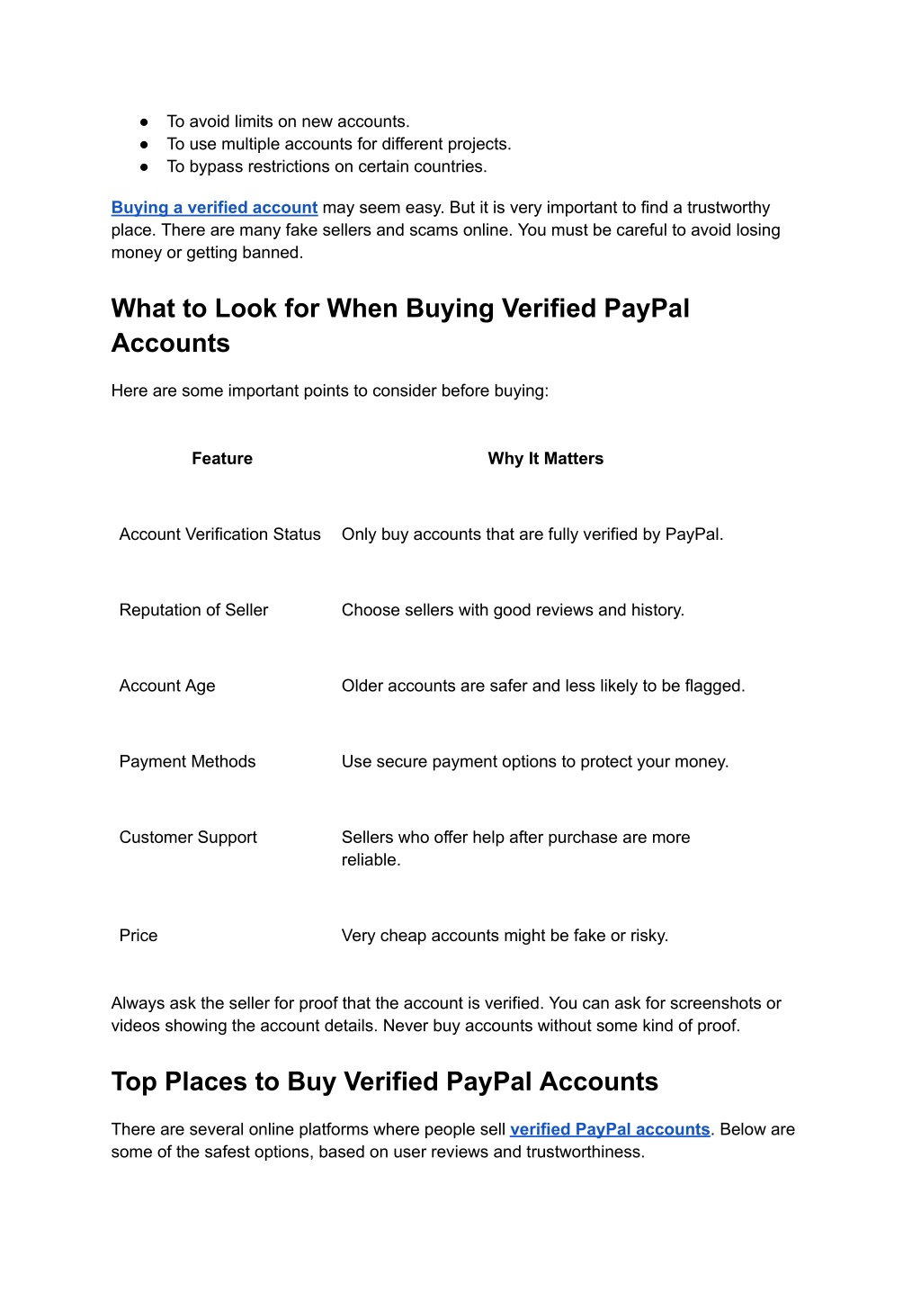● To avoid limits on new accounts. ● To use multiple accounts for different projects. ● To bypass restrictions on certain countries. Buying a verified account may seem easy. But it is very important to find a trustworthy place. There are many fake sellers and scams online. You must be careful to avoid losing money or getting banned. What to Look for When Buying Verified PayPal Accounts Here are some important points to consider before buying: Feature Why It Matters Account Verification Status Only buy accounts that are fully verified by PayPal. Reputation of Seller Choose sellers with good reviews and history. Account Age Older accounts are safer and less likely to be flagged. Payment Methods Use secure payment options to protect your money. Customer Support Sellers who offer help after purchase are more reliable. Price Very cheap accounts might be fake or risky. Always ask the seller for proof that the account is verified. You can ask for screenshots or videos showing the account details. Never buy accounts without some kind of proof. Top Places to Buy Verified PayPal Accounts There are several online platforms where people sell verified PayPal accounts. Below are some of the safest options, based on user reviews and trustworthiness.